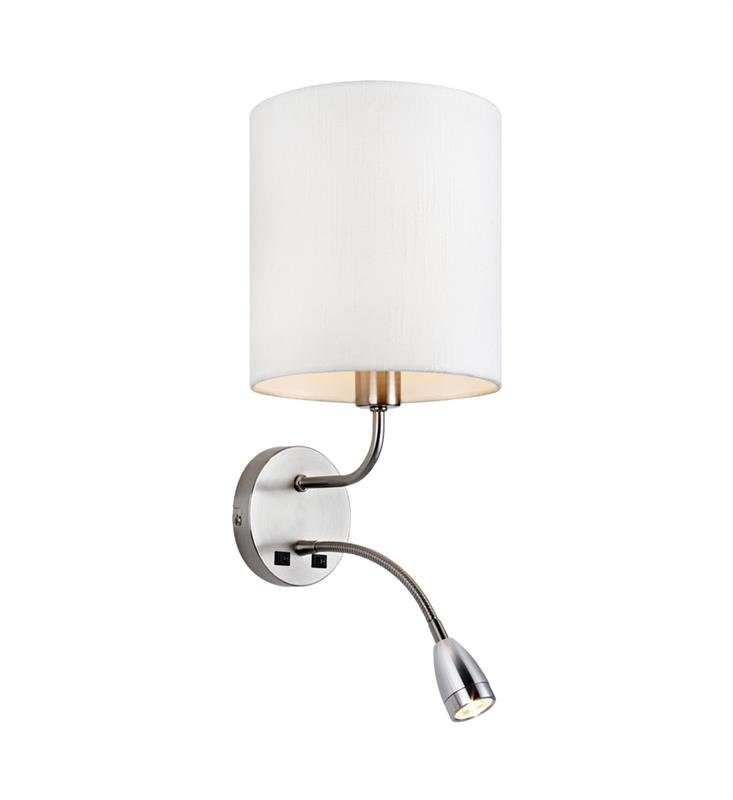 Mason stilfulla vägglampa med en mysig design. Kromat metallfäste med textilskärm. Separata strömbrytare på väggplattan. Lite (E14) lamphållare för max 40W glödljus eller motsvarande styrka i halogen, lågenergi eller LED. Läslampan är ställbar och har fast LED på 3W. 2 meter sladd. Mycket lätt för att hitta den rätta platsen för lampan i hemmet.