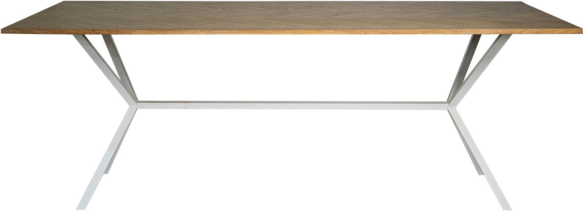 Revel matbord med vitt underrede i metall och toppskiva av fanér med fiskbensmönster. Ett stort matbord som ger plats åt många, kombinera gärna med stolar.