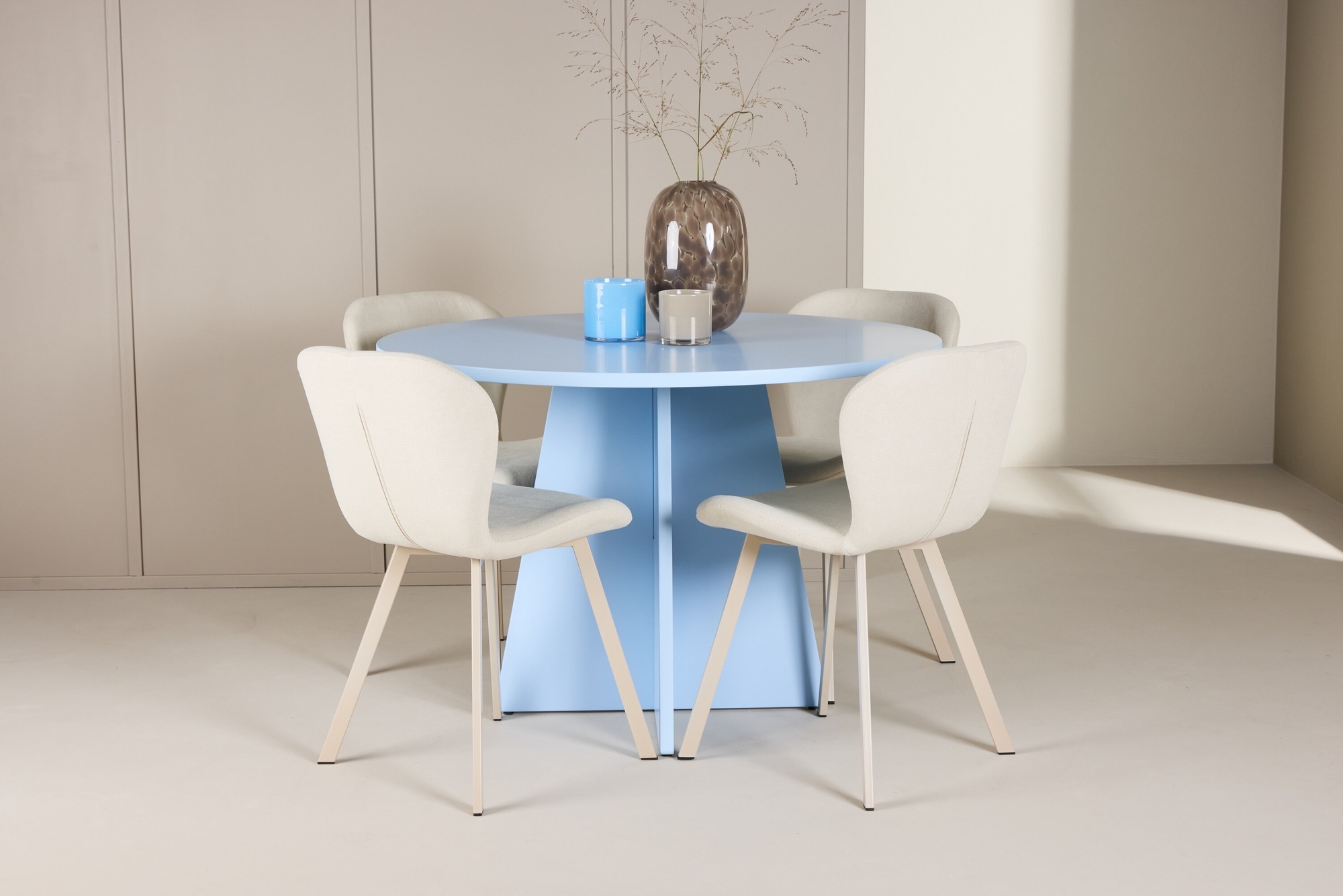 Matstolen Lilja är designad för att förena stil och komfort i en sofistikerad beige färg. Den mjuka klädseln ger en varm och inbjudande känsla som enkelt smälter in i både moderna och klassiska inredningsstilar. Stolens ergonomiska ryggstöd och generöst stoppade sits erbjuder hög komfort under långa middagar och trevliga samtal. Liljas tidlösa design gör den till en mångsidig lösning som förhöjer din matplats med både funktionalitet och elegans. Kombinera Lilja med matbordet Bootcut för att skapa en unik och stilfull matplats. Bootcut är ett modernt bord som fångar uppmärksamheten med sin enhetliga babyblå färg och runda form. Med en diameter på 110 cm blir det en naturlig samlingspunkt som främjar gemenskap och samtal. Den fräscha, babyblå nyansen ger bordet en ljus och luftig känsla som tillför en lekfull och trendig touch till ditt hem. Bordets design är både praktisk och estetiskt tilltalande, vilket gör det till en perfekt plats för såväl vardagsmiddagar som festliga tillfällen. Tillsammans skapar matstolen Lilja och matbordet Bootcut en harmonisk balans mellan klassisk elegans och modern lekfullhet. Den neutrala beige färgen på Lilja kompletterar Bootcuts fräscha babyblå nyans, vilket skapar en inbjudande och inspirerande miljö där stil och funktion möts. Låt denna kombination bli hjärtat i ditt hem - en plats där du kan njuta av varje måltid i en vacker och harmonisk atmosfär.