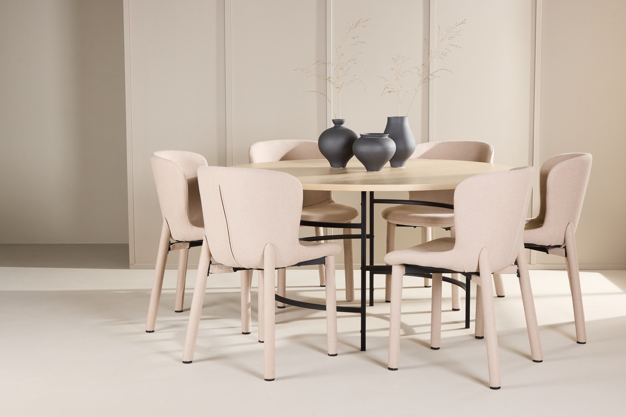 Förvandla din matplats med denna eleganta och stilrena matgrupp, som kombinerar tidlös design och lyxig komfort. Matbordet Copenhagen och matstolarna Astoria skapar en inbjudande och harmonisk atmosfär, perfekt för både vardagliga måltider och festliga tillställningar. Matbordet Copenhagen är en vacker möbel som förenar skandinavisk minimalism med praktisk funktion. Den rundade bordsskivan, som har en generös diameter på 140 cm, ger gott om plats för att samla familj och vänner. Den vittvättade ytan framhäver träets naturliga struktur och ger bordet en ljus och luftig känsla som smälter in i både moderna och klassiska inredningsstilar. Den neutrala nyansen på bordsskivan gör det lätt att matcha med olika färger och inredningsdetaljer, vilket gör Copenhagen till ett tidlöst val för ditt hem. Tillsammans med bordet kommer matstolarna Astoria, som är klädda i exklusiv beige bouclé. Den mjuka och lyxiga texturen på bouclétyget ger stolarna en sofistikerad och inbjudande känsla, perfekt för att skapa en varm och ombonad matplats. Stolarna har ett ergonomiskt designat ryggstöd och en bekväm sits som gör dem ideala för långa, njutbara måltider. Den subtila strukturen på tyget och den naturliga nyansen gör att stolarna enkelt kan integreras i olika inredningsstilar. Låt denna matgrupp med Copenhagen och Astoria bli mittpunkten i ditt hem, där den eleganta designen och den genomtänkta komforten gör varje måltid till en stilfull och avkopplande upplevelse.