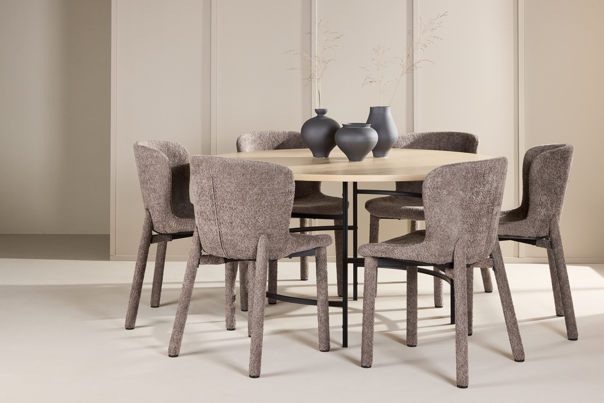 Upplev en perfekt kombination av stil, komfort och funktionalitet med denna eleganta matgrupp bestående av matbordet Copenhagen och matstolarna Astoria. Tillsammans skapar de en inbjudande och sofistikerad atmosfär som gör varje måltid till en upplevelse. Matbordet Copenhagen är en tidlös möbel som förenar skandinavisk minimalism med praktisk funktion. Den rundade bordsskivan, med en generös diameter på 140 cm, erbjuder gott om utrymme för både vardagliga måltider och festliga tillställningar. Den vittvättade ytan på bordsskivan framhäver träets naturliga struktur och ger bordet en ljus, luftig känsla som passar både moderna och klassiska inredningsstilar. Den neutrala färgen gör bordet lätt att matcha med olika färger och inredningsdetaljer, och den runda formen uppmuntrar till social interaktion och gemenskap runt bordet. Tillsammans med bordet kommer matstolarna Astoria, klädda i en elegant brun bouclé. Stolen har en varm och inbjudande känsla tack vare det rika, texturerade bouclétyget. Den djupa bruna nyansen och den mjuka ytan ger ett lyxigt och omfamnande intryck, och den subtila strukturen smälter vackert in i både moderna och klassiska miljöer. Stolen är designad för att ge maximal komfort, med ett omslutande ryggstöd och en bekväm sittdyna, vilket gör den idealisk för långa och avkopplande måltider. Låt Copenhagen och Astoria förvandla din matplats till en harmonisk och stilfull miljö, där varje måltid kan avnjutas med elegans och komfort.