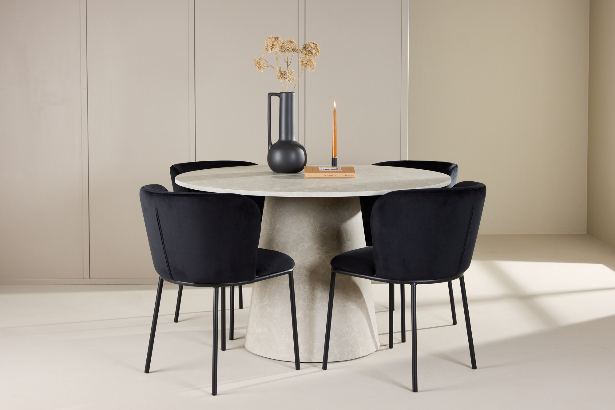 Uppgradera din matplats med den eleganta och sofistikerade gruppen bestående av matbordet Lanzo och matstolen Edina, som tillsammans skapar en lyxig och inbjudande atmosfär. Matbordet Lanzo har en stilren design med en vacker beige marmorerad yta som efterliknar naturstenens tidlösa skönhet. Den exklusiva marmorkänslan ger bordet en sofistikerad och elegant look som passar perfekt i både moderna och klassiska inredningar. Den runda formen uppmuntrar till gemenskap och närhet, vilket gör det enkelt att samla dina nära och kära kring bordet för både intima middagar och större sociala tillställningar. Den släta ytan är lätt att rengöra och gör bordet både praktiskt och funktionellt. Tillsammans med bordet får du matstolen Edina, en stol som kombinerar lyxig design med komfort. Den är klädd i svart sammet som ger en rik och inbjudande känsla, samtidigt som den mjuka texturen gör stolen extra bekväm att sitta i. Den djupa, svarta nyansen tillför glamour och elegans till din matplats, medan den stilrena designen gör den lätt att matcha med olika inredningsstilar. Den ergonomiska formen och robusta konstruktionen säkerställer både komfort och hållbarhet för långa middagar och sociala tillställningar. Med Lanzo och Edina får du en perfekt kombination av funktion, stil och elegans. Låt dessa komponenter bli en central del av ditt hem och skapa en inbjudande och elegant atmosfär för alla dina måltider och sammankomster.