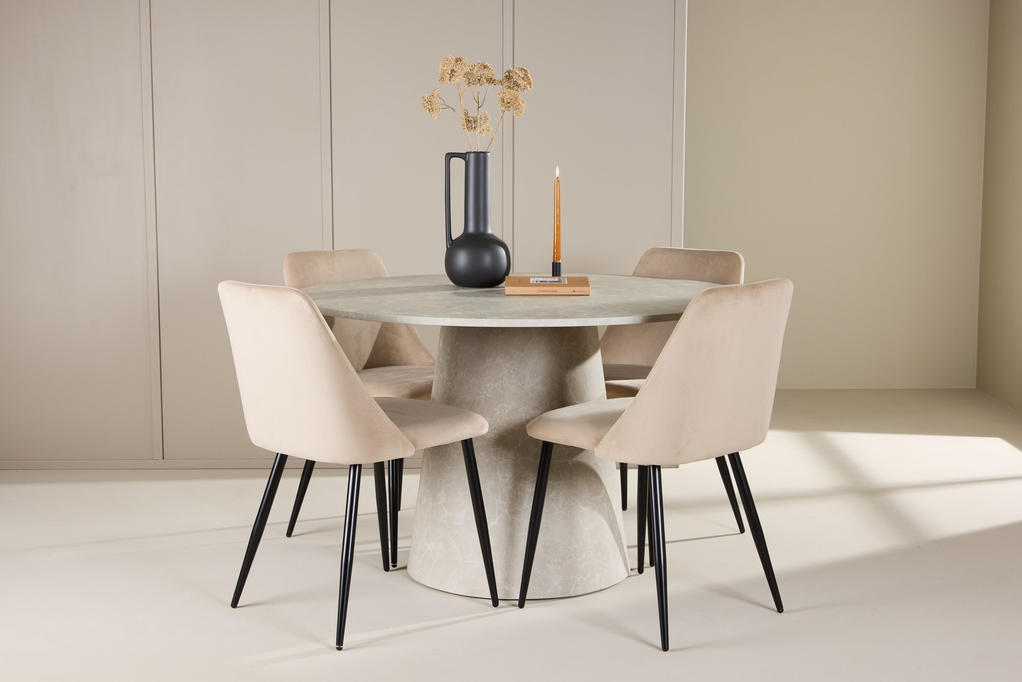 Förvandla din matplats till en elegant och inbjudande miljö med den stilrena gruppen bestående av matbordet Lanzo och matstolen Night - en perfekt kombination av lyx, komfort och tidlös design. Matbordet Lanzo erbjuder en sofistikerad och exklusiv känsla med sin vackra beige marmorerade yta, som efterliknar naturstenens tidlösa skönhet. Bordet passar utmärkt i både moderna och klassiska inredningar och skapar en inbjudande atmosfär vid varje måltid. Den runda formen uppmuntrar till gemenskap och gör det enkelt för alla runt bordet att delta i samtal och sociala aktiviteter. Lanzo är lika praktiskt som vackert, med en slät yta som är lätt att rengöra - idealiskt för både vardagsbruk och festliga tillställningar. Tillsammans med bordet matchas matstolen Night, en elegant och bekväm stol som ger en sofistikerad känsla till din matplats. Stolen är klädd i mjuk beige sammet som skapar en inbjudande sittupplevelse, och de svarta benen ger en stilren kontrast till den ljusa sitsen. Night har en ergonomisk design som ger bra stöd för ryggen, vilket gör den perfekt för långa middagar. Kombinationen av den lyxiga sammeten och de svarta benen ger stolen en balanserad och modern look som höjer inredningens elegans. Med Lanzo och Night får du en matplats som är både stilfull och funktionell, där lyx och komfort möts i en harmonisk helhet. Skapa en inbjudande och elegant atmosfär där du kan njuta av varje måltid och samvaro.