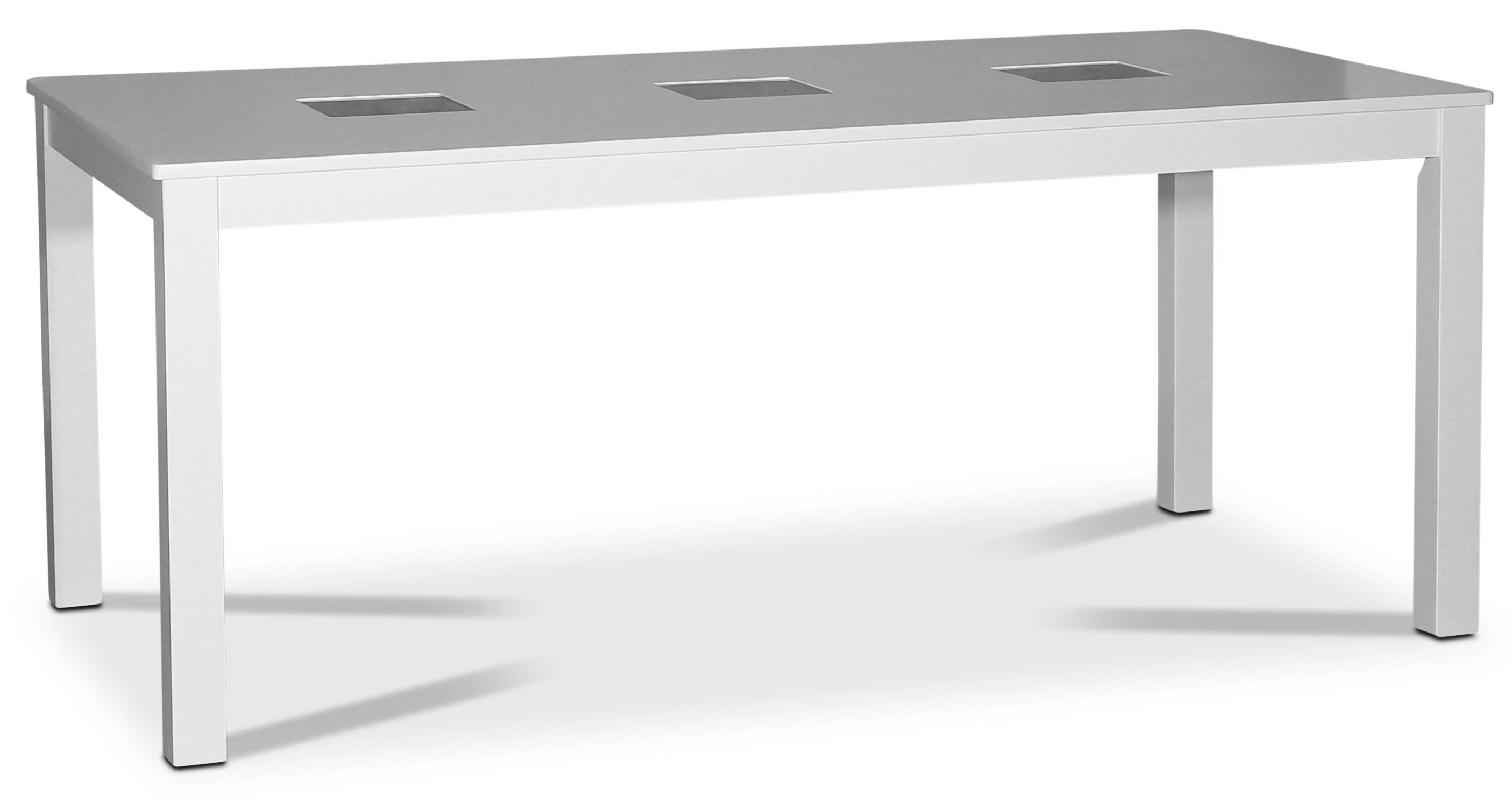 Rymligt bord i vitlackat massivt trä och MDF. I bordsskivan finns infällda svarta glaspartier som snygga detaljer.