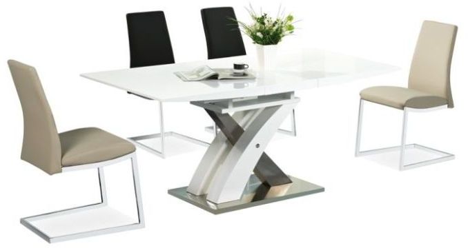 Ett snyggt matbord med en modern design. Underredet är tillverkat av MDF och borstad stål och bordsskivan är av vitlackerad MDF med högglans. Bordet är praktiskt då du lätt kan förlänga det från 140 cm till 180 cm. Tilläggsskiva ingår.