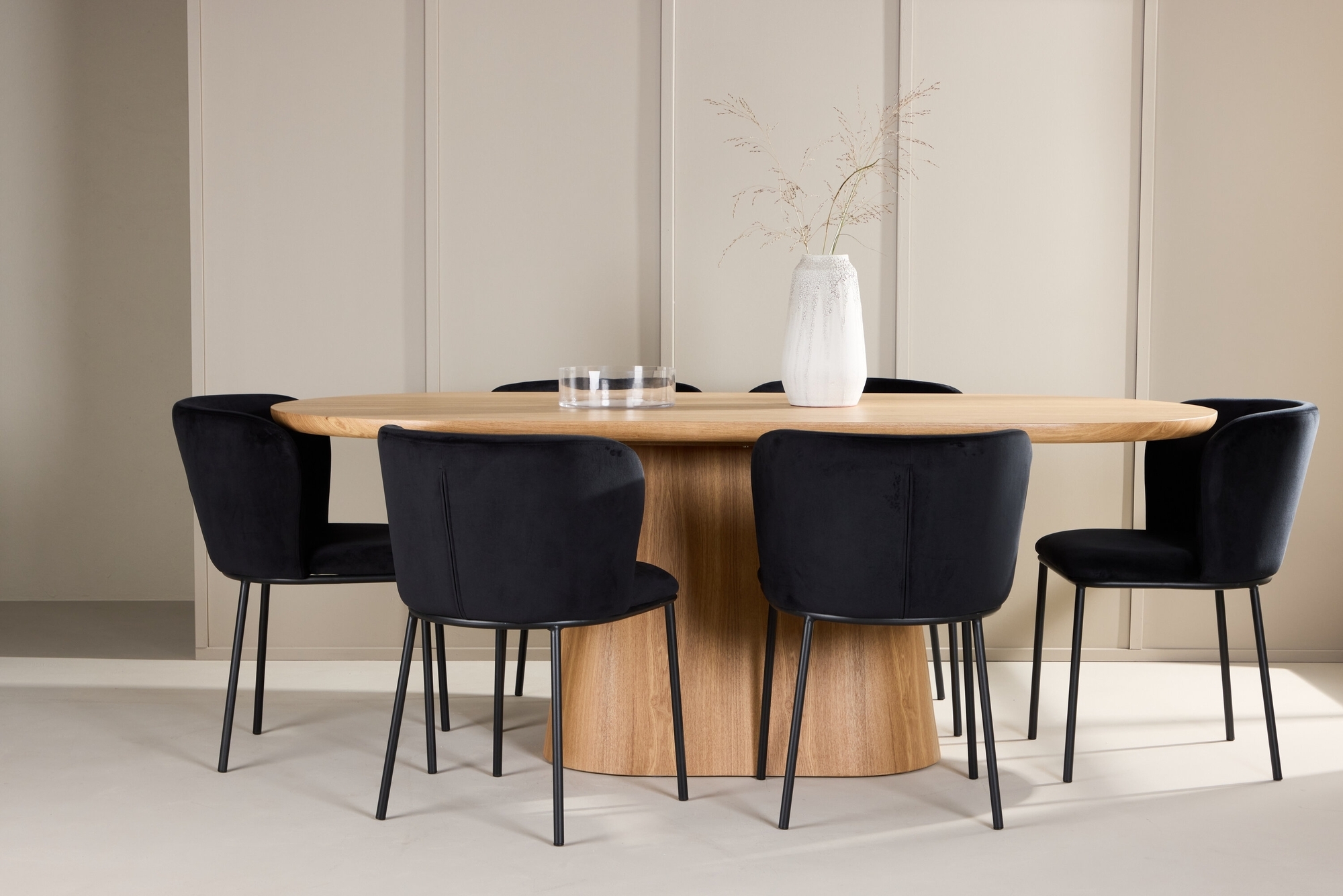 Förvandla din matplats med denna eleganta matgrupp bestående av matbordet Stjärnö och matstolen Edina - en perfekt kombination av stil, komfort och funktion. Matbordet Stjärnö är en imponerande möbel som med sina generösa mått på 200x90 cm erbjuder gott om plats för både vardagliga måltider och större sammankomster. Bordsskivan i MDF med en naturträfärgad finish ger en varm och inbjudande känsla som passar perfekt in i alla typer av inredningar. Den harmoniska tonen gör det enkelt att kombinera bordet med olika stolar och inredningsdetaljer, vilket ger en enhetlig och stilfull look i ditt matrum. Den robusta konstruktionen och den släta ytan gör bordet både hållbart och lätt att underhålla, vilket gör det perfekt för dagligt bruk. Till bordet matchar vi matstolen Edina, en stol som förhöjer din matplats med sin sofistikerade design och lyxiga komfort. Sitsen är klädd i svart sammet, vilket ger en rik och glamourös känsla. Den djupa svarta tonen tillför elegans och stil, medan sammetens mjuka textur gör stolen extra bekväm för långa middagar och sociala tillställningar. Stolen har en ergonomisk design som ger bra stöd, vilket gör den både funktionell och vacker i ditt hem. Tillsammans skapar Stjärnö och Edina en harmonisk och inbjudande matplats där varje måltid blir en njutbar upplevelse.