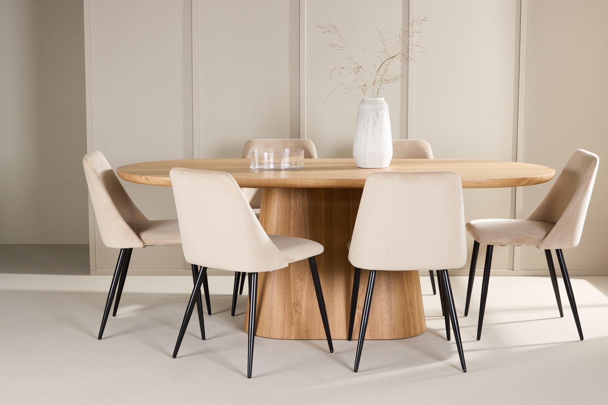 Förvandla ditt matrum med denna eleganta matgrupp, som består av det stilrena matbordet Stjärnö och de lyxiga matstolarna Night. Tillsammans skapar de en harmonisk och inbjudande atmosfär, perfekt för både vardagliga måltider och festliga sammankomster. Matbordet Stjärnö är designat för att kombinera funktionalitet med en varm och naturlig estetik. Med sina generösa mått (200x90 cm) erbjuder det gott om plats för alla dina gäster. Bordsskivan, tillverkad i MDF, har en naturträfärgad finish som framhäver träets autentiska utseende och skapar en inbjudande känsla i ditt matrum. Den släta ytan gör bordet lätt att underhålla, medan den robusta konstruktionen säkerställer att det står stabilt och pålitligt vid varje måltid. Matstolarna Night är klädda i mjuk beige sammet som ger både elegans och komfort. Den neutrala färgen passar perfekt med olika inredningsstilar och tillför en sofistikerad känsla till ditt matrum. De svarta benen ger en fin kontrast och lyfter fram stolens stilrena design, medan den ergonomiska utformningen säkerställer bra sittkomfort under längre måltider. Kombinationen av lyxig sammet och robusta ben gör Night både vacker och hållbar. Tillsammans erbjuder matbordet Stjärnö och matstolarna Night en perfekt balans mellan modern design och funktionalitet, och skapar en inbjudande och elegant miljö för varje måltid. Oavsett om du samlar familj och vänner för en vardagsmiddag eller bjuder in till en festlig sammankomst, kommer denna matgrupp att vara en stilfull mittpunkt i ditt hem.