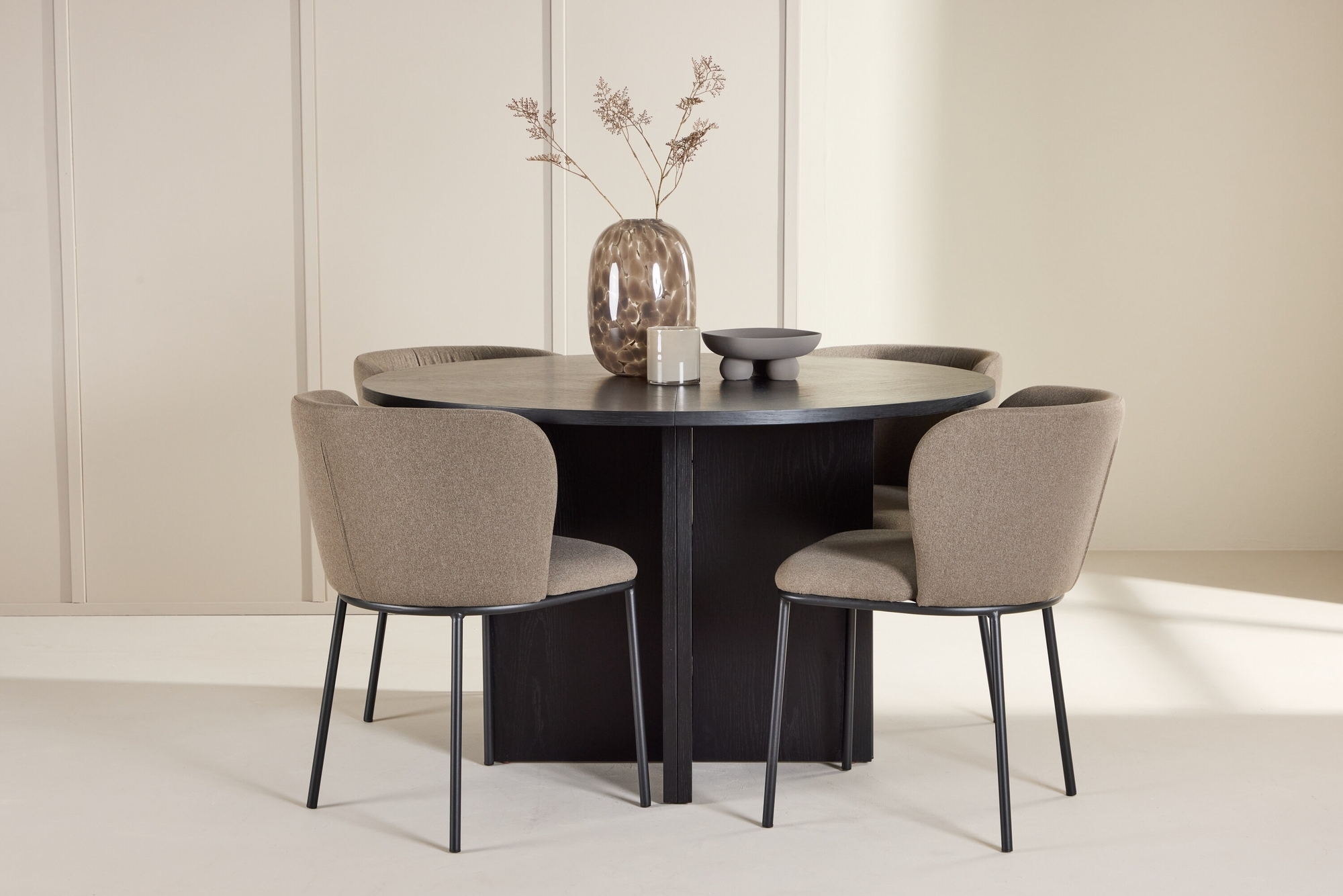 Förvandla ditt matrum med denna stiliga matgrupp, bestående av det eleganta matbordet Strada och de bekväma matstolarna Edina. Tillsammans skapar de en harmonisk och inbjudande atmosfär, perfekt för både vardagliga måltider och större sammankomster. Matbordet Strada kombinerar modern design med flexibilitet. Tillverkat i svart fanerträ, ger bordet en sofistikerad och tidlös känsla som passar i många inredningsstilar. Bordet har en ursprunglig diameter på 120 cm, vilket skapar en intim matplats, men kan enkelt förlängas till 170 cm för att ge extra plats vid större tillställningar. Den smidiga förlängningsfunktionen gör att du snabbt kan anpassa bordet efter dina behov, vilket gör det både praktiskt och stilfullt. Matstolarna Edina är klädda i ett vackert brunt linnetyg som ger en rustik och naturlig känsla. Den varma bruna tonen tillför en jordnära elegans och passar perfekt i olika inredningsstilar, från skandinavisk minimalism till klassisk charm. Den ergonomiska designen ger bra stöd under långa middagar, medan den robusta konstruktionen och det slitstarka linnetyget säkerställer lång hållbarhet. Tillsammans erbjuder matbordet Strada och matstolarna Edina en perfekt balans mellan funktion och stil. Den svarta fanerträkonstruktionen på bordet kompletteras vackert av de varma tonerna i stolarna, vilket skapar en elegant och inbjudande miljö för varje måltid. Oavsett om du samlar familjen för en vardagsmiddag eller bjuder in till en festlig måltid, blir denna matgrupp en central och stilfull del av ditt hem.