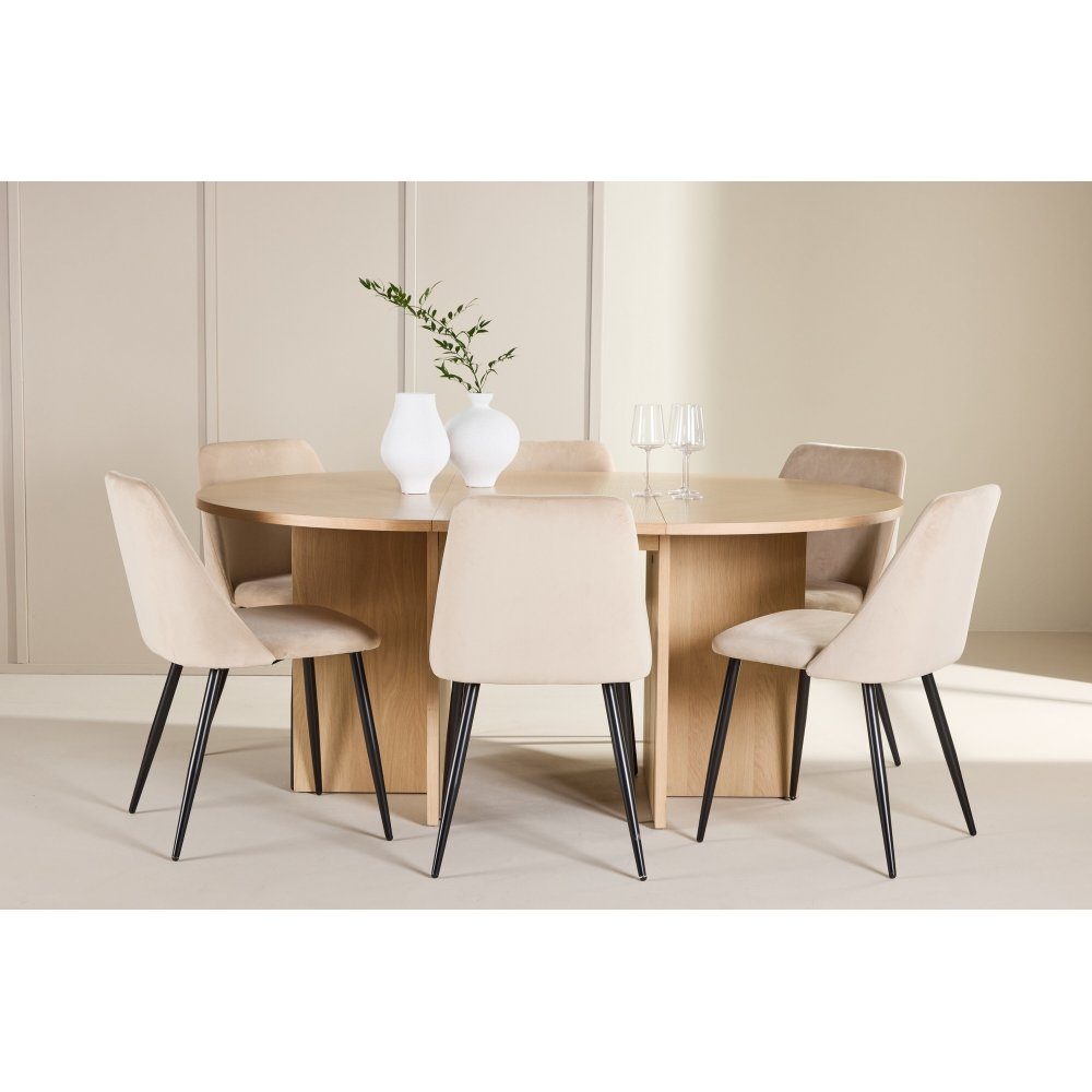 Skapa en elegant och tidlös matplats med matstolen Night och matbordet Strada. Förvandla din matplats med en perfekt balans mellan sofistikerad stil och praktisk funktionalitet. Matstolen Night och matbordet Strada kompletterar varandra och skapar en inbjudande atmosfär för alla dina måltider och sammankomster. Matstolen Night är designad för att kombinera komfort och elegans. Klädd i mjuk beige sammet erbjuder stolen en lyxig och inbjudande sittupplevelse, medan den neutrala tonen ger en sofistikerad touch som passar alla inredningsstilar - från modern minimalism till klassisk charm. De svarta benen ger en elegant kontrast till den ljusa sitsen och skapar en stilren profil som lyfter din matplats. Med sin ergonomiska utformning och robusta konstruktion erbjuder Night en bekväm plats för långa, avkopplande middagar. Matbordet Strada är en stilfull och flexibel lösning som möter både dina estetiska och praktiska behov. Tillverkat i vittvättat fanerträ ger bordet en ljus och luftig känsla, medan träets naturliga struktur tillför en subtil elegans som smälter in i både moderna och klassiska inredningar. Med en diameter på 120 cm är Strada perfekt för vardagens måltider, men tack vare den smidiga förlängningsfunktionen kan bordet enkelt utökas till 170 cm för att välkomna fler gäster vid festliga tillfällen. Tillsammans skapar matstolen Night och matbordet Strada en matplats som förenar komfort, stil och funktionalitet. Den lyxiga sammeten och de stilrena benen på Night kompletterar Stradas flexibla, vittvättade design och gör denna kombination till en elegant och praktisk mittpunkt i ditt hem. Låt Night och Strada bli platsen där du samlar familj och vänner för att skapa minnesvärda stunder vid varje måltid.