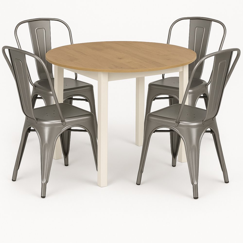 Matgrupp Berivan Ø102–142 cm ek/vit med 4 st Industry stolar i borstat stål