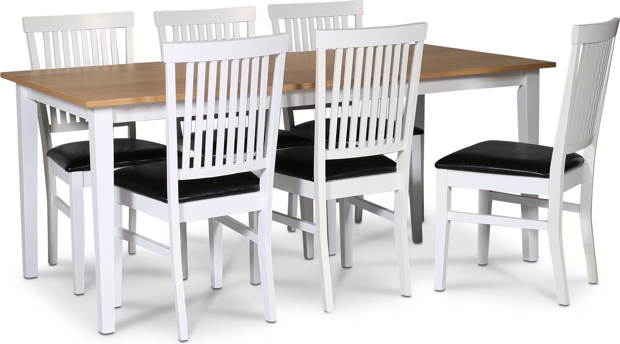Fårö matgrupp från Skånska Möbelhuset, klassiskt matbord 180x90 cm med vitt underrede och en toppskiva i oljad ekfanèr. Det ingår 6 stycken matchande Fårö matstolar med ribbor i ryggen och sits i svart PU. Stol i vitlackat trä.