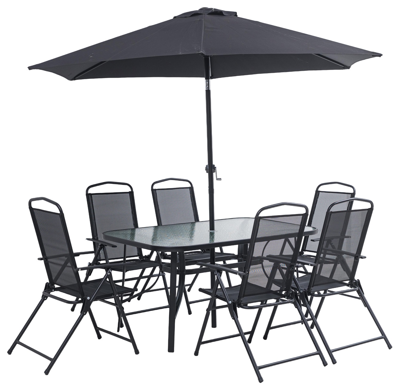 Växjö utegrupp är en komplett matgrupp som består av sex fällbara positionsstolar med svart metallstomme och bekvämt textilene-tyg. Till gruppen hör även ett matchande parasoll samt ett rektangulärt bord med en elegant, vågformad glasskiva. Den nätta designen gör utegruppen enkel att placera på både altan och uteplats. Parasollen öppnas och stängs smidigt med ett vevhandtag och kan dessutom vinklas för att ge optimal skugga.