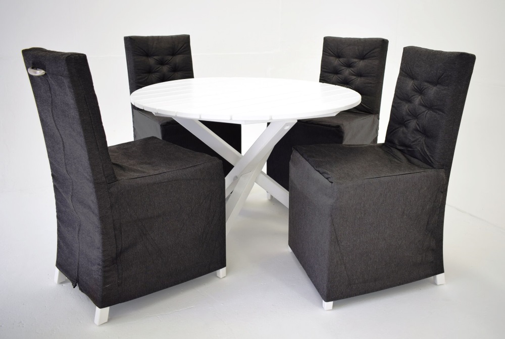Matgrupp till utemöblemanget från Skånska Möbelhuset. Modernt runt bord i vitmålad furu inklusive 4 st matchande stolar. En stilren och samtidigt modern möbelgrupp som gör sig bra på uteplatsen.