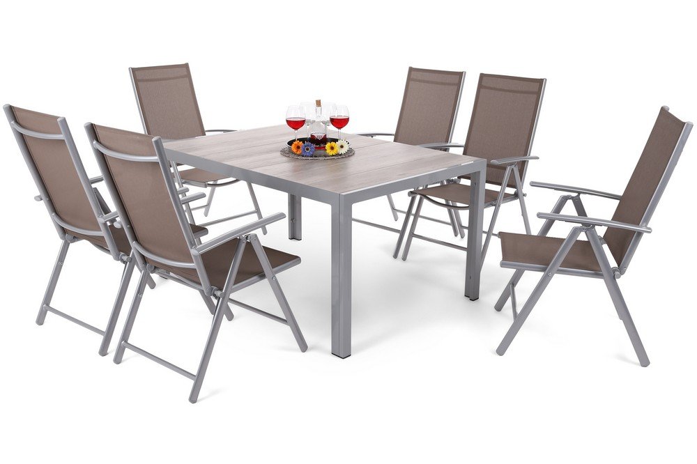 Matgrupp med bordsskiva i keramik. Keramik är väderbeständig, lätt att rengöra och tål höga temperaturer (upp till 200 °C). Bordet har en extremt stabil konstruktion med pulverlackade aluminiumprofiler. Möbelgruppen inkluderar sex Ibiza Basic positionsstolar med 7 olika positioner för ryggstödet.