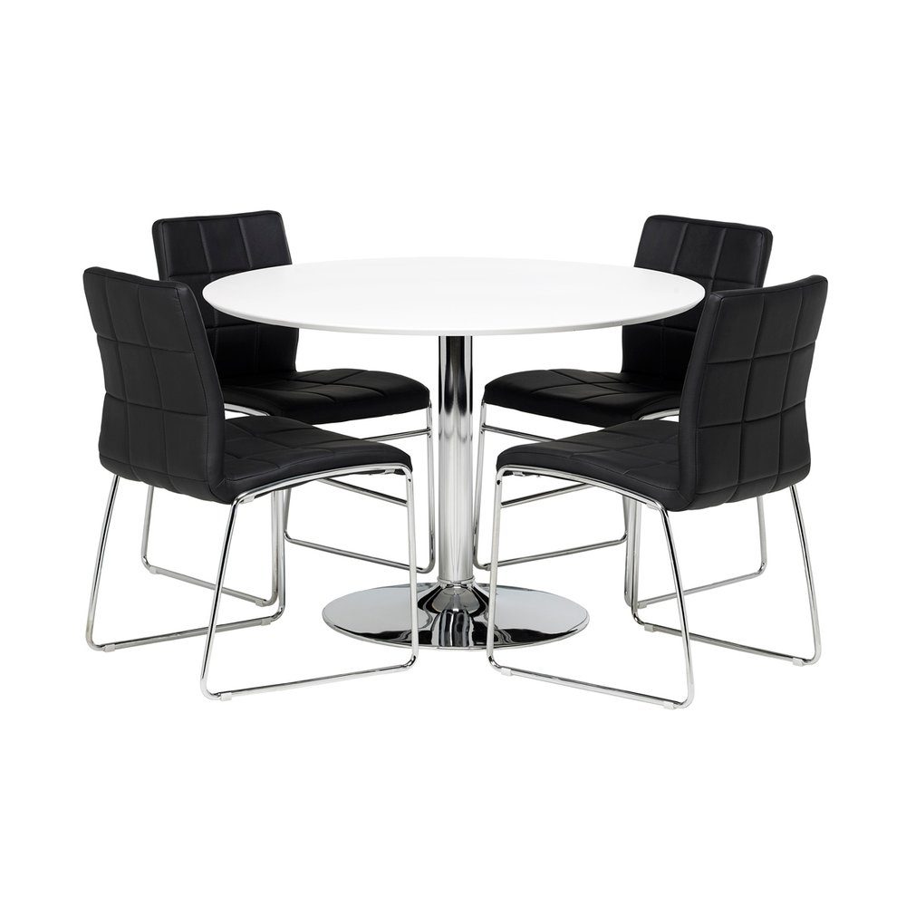 En matgrupp bestående av Crica matbord - vit/krom - ø110 cm + 4 st stolar. För med detaljerad information, se respektive produkt i detta paket.