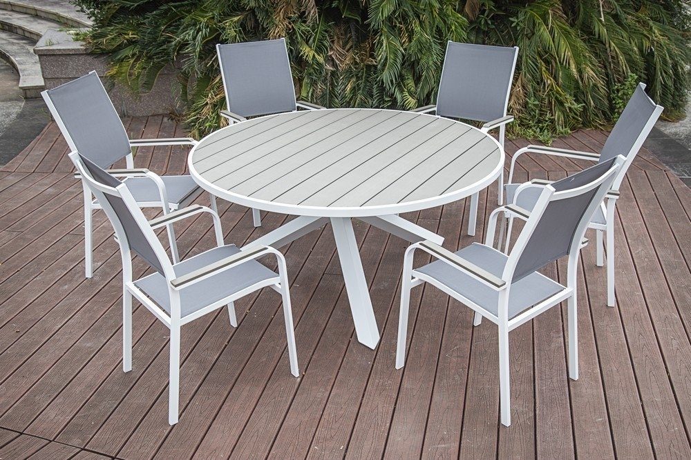 Stilren utegrupp med 4 st stolar i vit metalstomme och grått tyg.