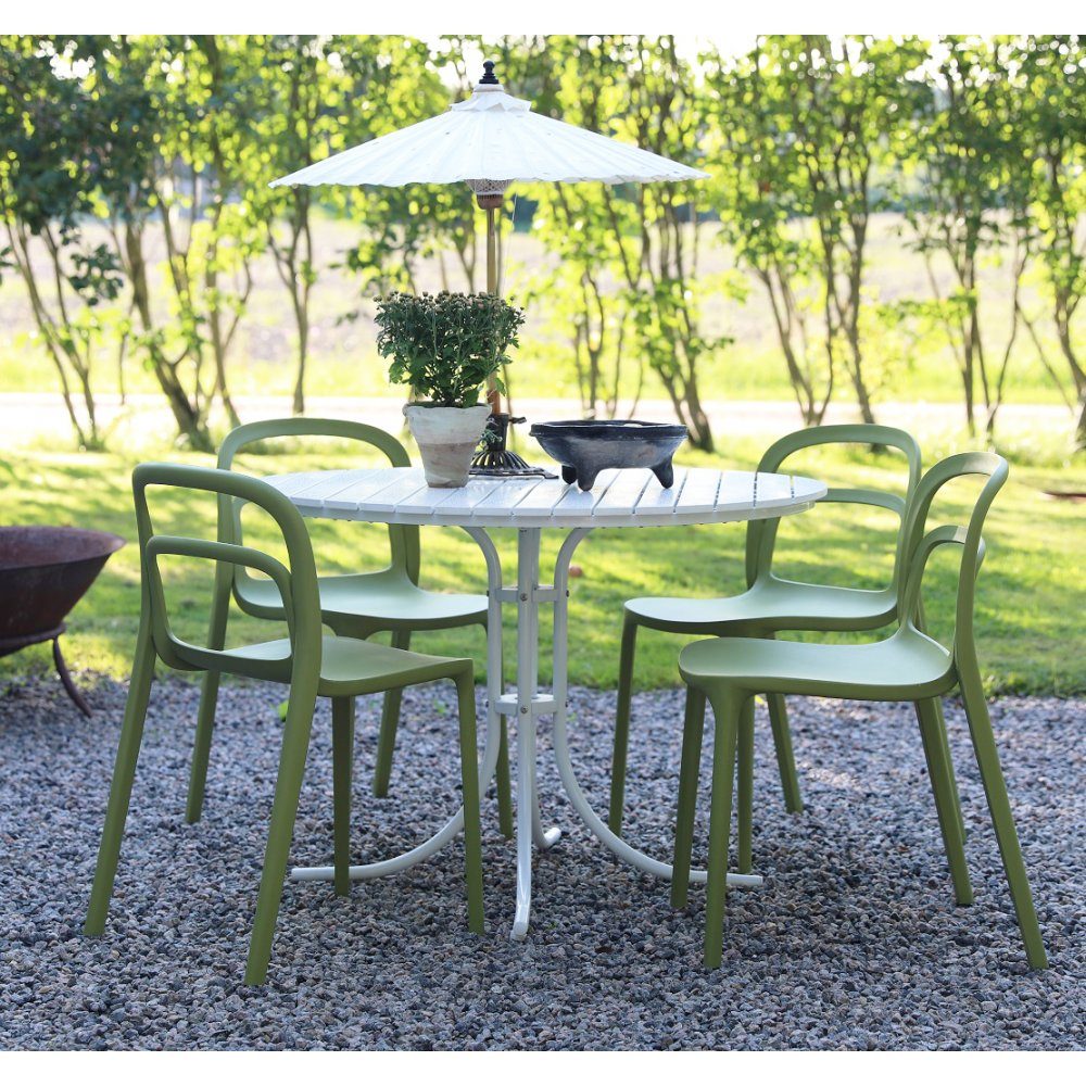 En nätt matgrupp till uteplatsen från Skånska Möbelhuset. Holmö runt matbord Ø103 cm i diameter med vitlackat underrede och vit aintwood toppskiva. Till matgruppen medföljer 4 st stapelbara Nordanå stolar i grön formgjuten plast. En matgrupp i harmoni där möblerna går snyggt ihop och skapar en helhet som är svåröverträffad. Passar lika bra i uterummet som på altanen.