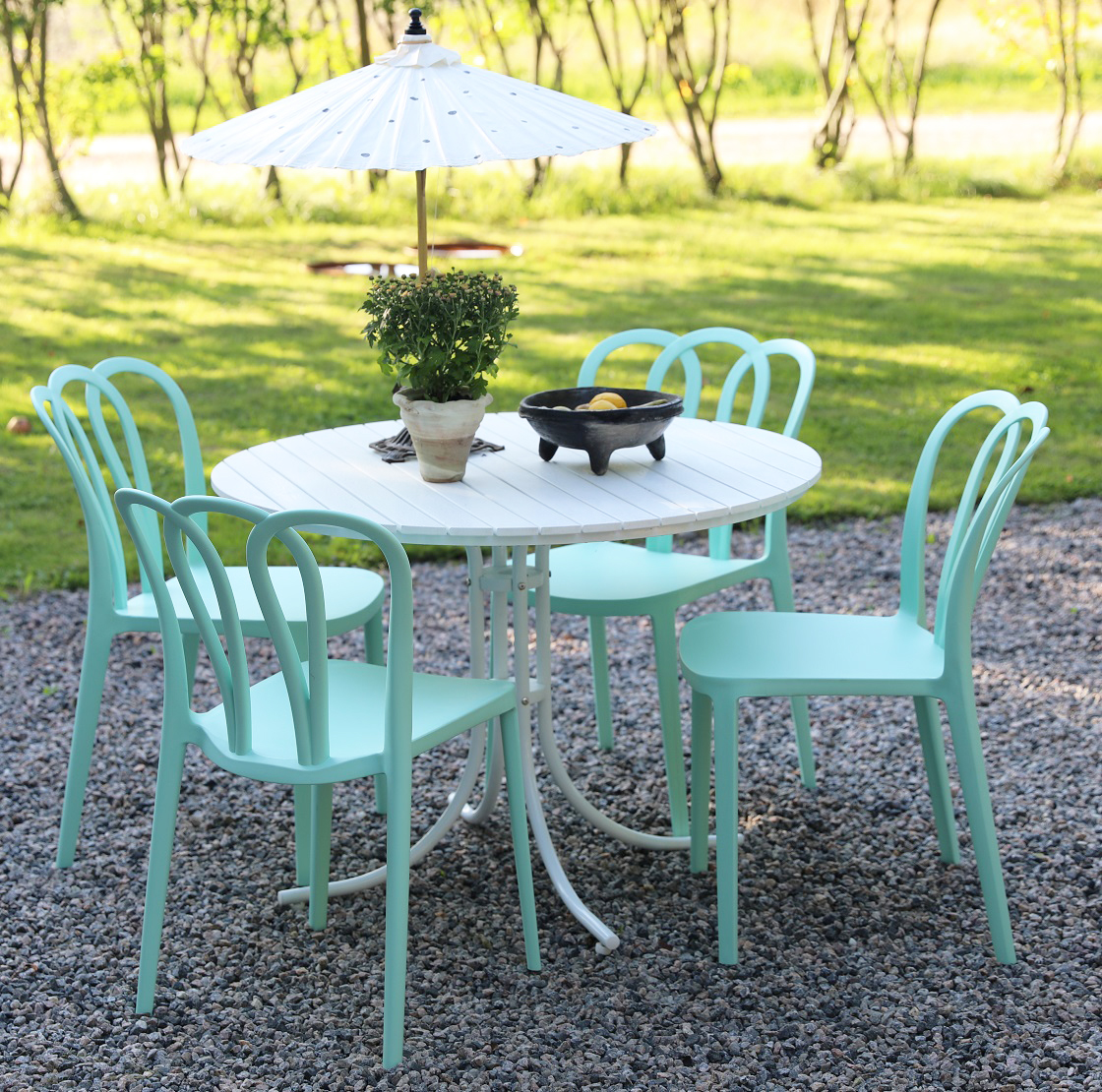 En nätt matgrupp till uteplatsen från Skånska Möbelhuset. Holmsund runt matbord Ø103 cm i diameter med vitlackat underrede och vit aintwood toppskiva. Till matgruppen medföljer 4 st stapelbara Bally stolar i mintgrön formgjuten plast. En matgrupp i harmoni där möblerna går snyggt ihop och skapar en helhet som är svåröverträffad. Passar lika bra i uterummet som på altanen.