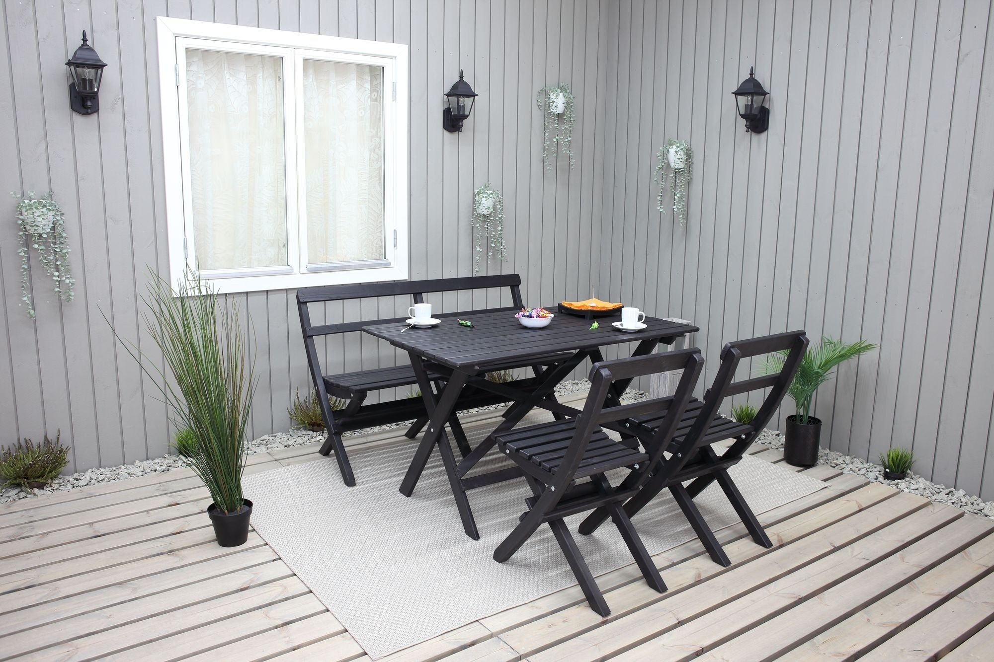Klassisk matgrupp i svartlaserat trä för trädgården. Settet är komplett med soffa, 2 stolar och bord. En utegrupp som smälter bra in i de flesta trädgårdar.