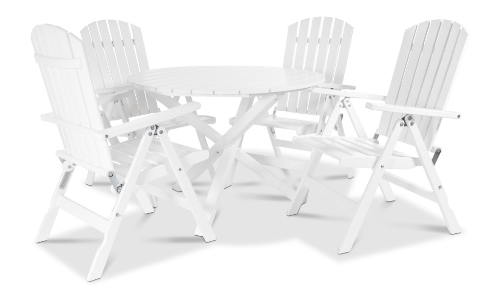 Matgrupp Kungshamn erbjuder ett modernt bord i vitmålad furu samt 4 st matchande positionsstolar. En stilren och funktionell matgrupp. Här kan man samlas varma sommardagar för att äta, fika eller bara koppla av.
