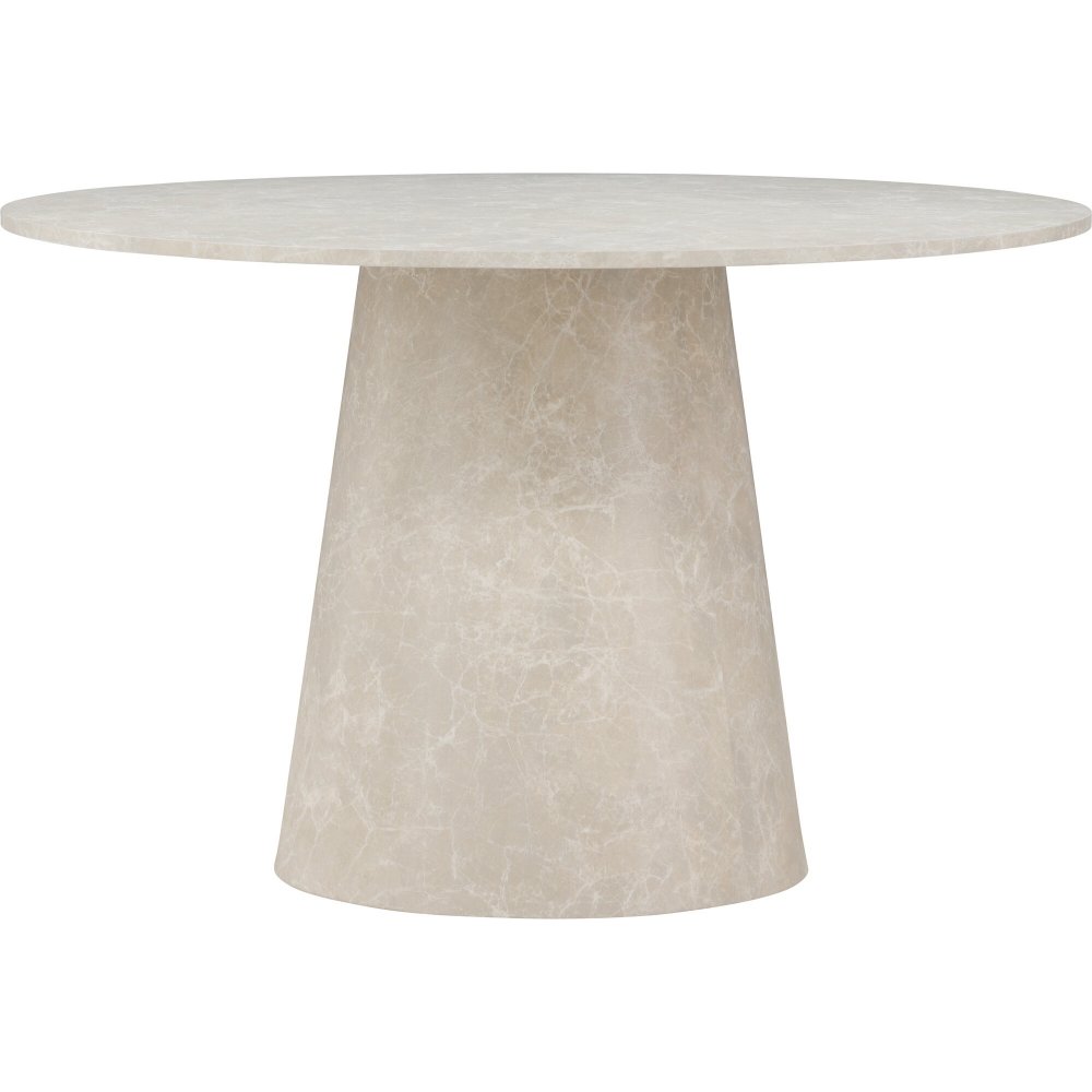 Lanzo matbord har en rund bordsskiva i marmorerad beige finish som ger känslan av natursten, men med fördelen av en lättskött och tålig yta. Bordet har en diameter på 120 cm, vilket gör det idealiskt för både vardag och fest. Den runda formen främjar gemenskap och gör att alla runt bordet sitter nära varandra. Dess tidlösa uttryck gör att det passar lika bra i moderna miljöer som i klassiska interiörer.