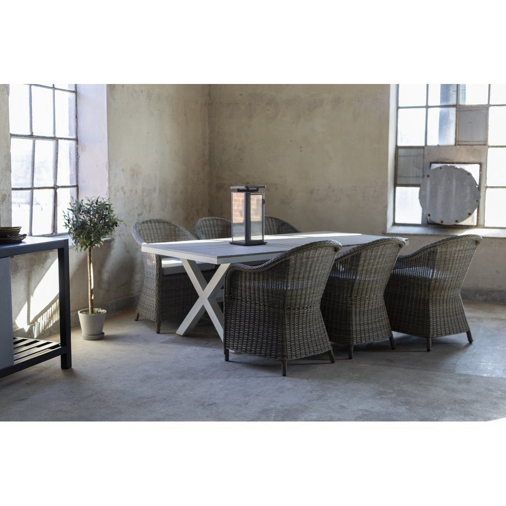 Stor och rymlig matgrupp för uteplatsen, stolar i ljusgrå/brun konstrotting med gråbeige sittdynor. Bord av gråpolywood med kryssben i vit aluminium för att ge en stabil känsla och ett väderbeständigt uteset.