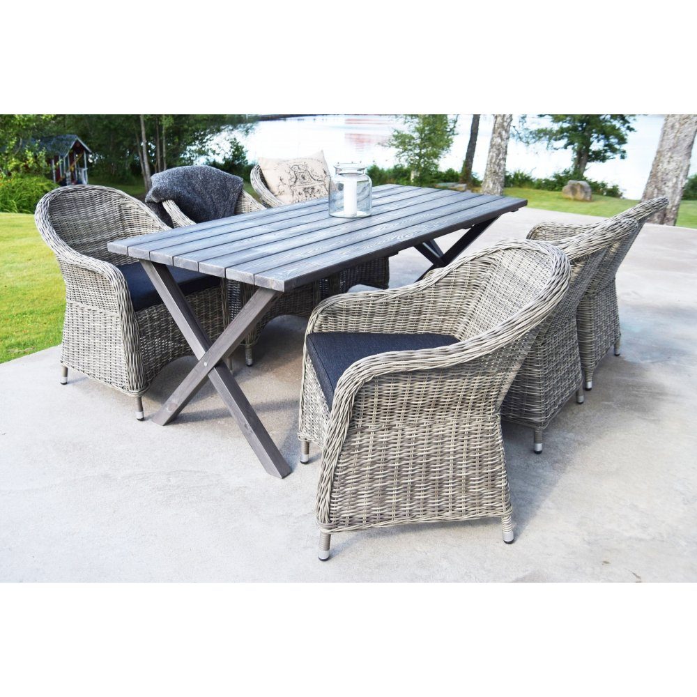 Matgrupp till utemöblemanget från Skånska Möbelhuset. Bord i grålaserad furu med kryssben samt 6 st Mercury matchande fåtöljer i cementgrå utförande. En matgrupp i harmoni där möblerna går snyggt ihop och skapar en helhet som är svåröverträffad. Bordet har behandlats för att få den patina man förknippar med Shabby Chic. Eftersom detta arbete sker för hand får varje exemplar ett unikt utseende.