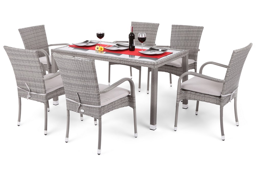 Matgrupp Mori är ett elegant set tillverkat i konstrotting. De pulverlackerade aluminiumprofilerna ger möbelgruppen stabilitet och tålighet. Konstrottingen är extremt tålig och ihop med bordsskivan i härdat glas tål detta set alla utomhusförhållanden.Stolarna inkluderar sittdynor.