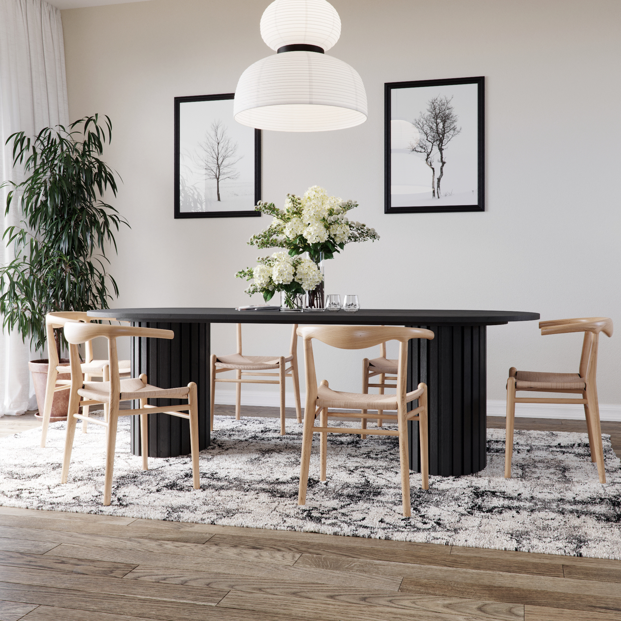 Vår PiPi bordsserie står för hantverk, design och hållbarhet. Vi erbjuder valnöt, whitewash, svartbetsat trä och ek. Serien innehåller olika storlekar och utföranden. Välj just ditt utförande för matplatsen. Denna modellen har en snygg ovalskiva, utförande svartbetsat fanèr.