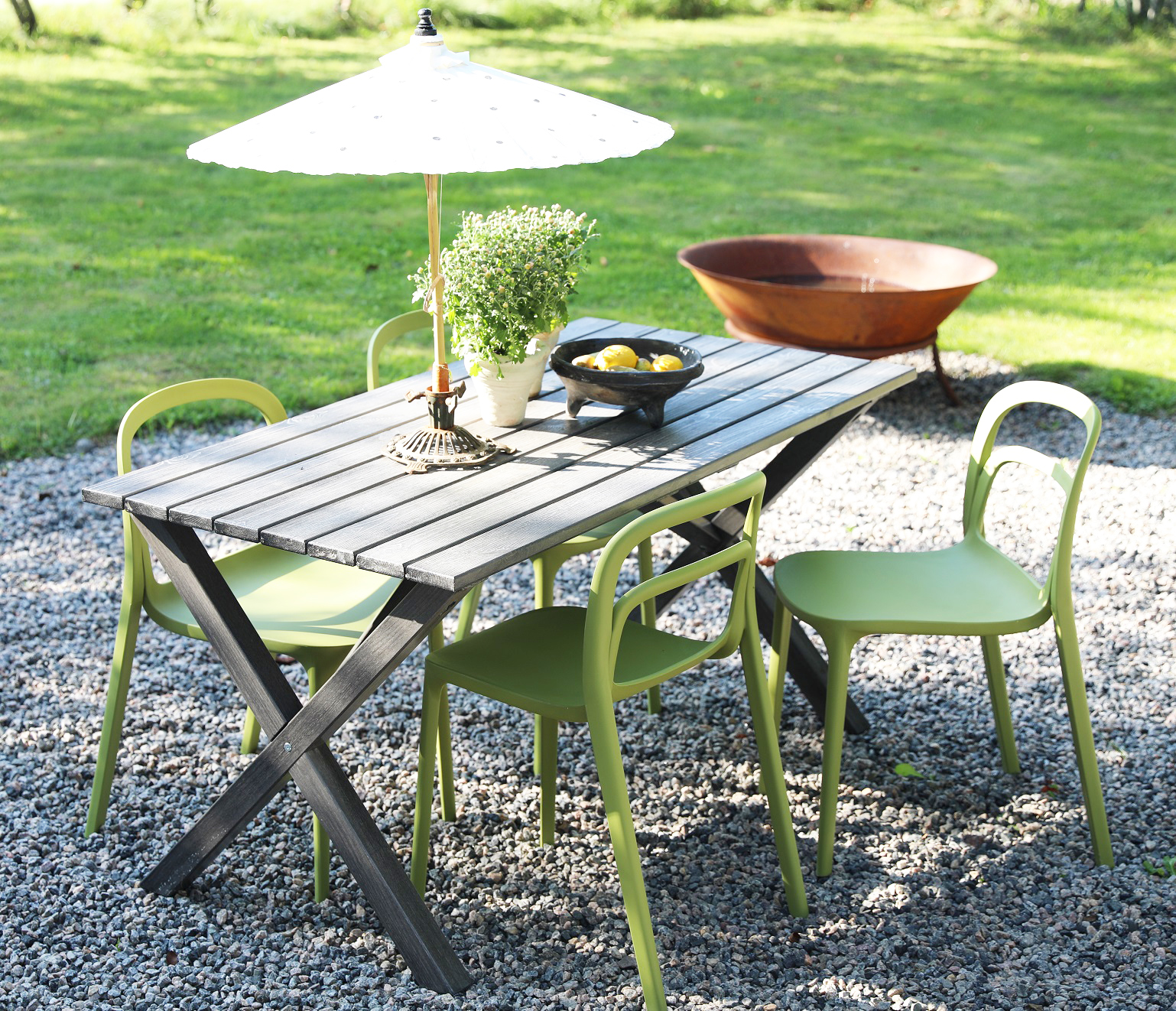 En nätt matgrupp till uteplatsen från Skånska Möbelhuset. Saltö runt matbord i teak med 4 st stapelbara Nordanå stolar i grön formgjuten plast. En matgrupp i harmoni där möblerna går snyggt ihop och skapar en helhet som är svåröverträffad. Passar lika bra i uterummet som på altanen.