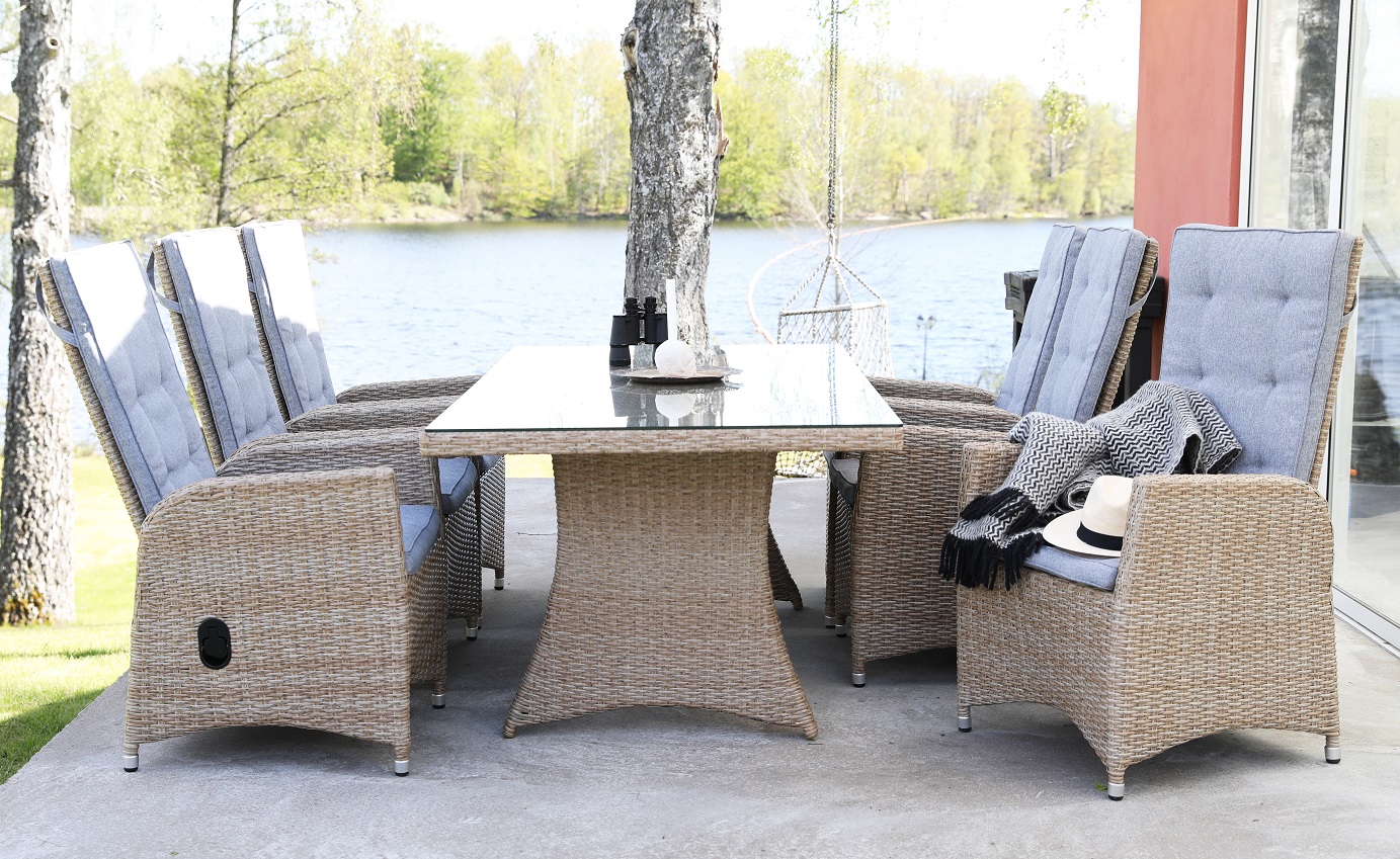 Matgrupp till utemöblemanget från Skånska Möbelhuset. Sienna matbord i naturfärgad rotting samt 6 st ställbara Sienna fåtöljer. En matgrupp i harmoni där möblerna går snyggt ihop och skapar en helhet som är svåröverträffad.
