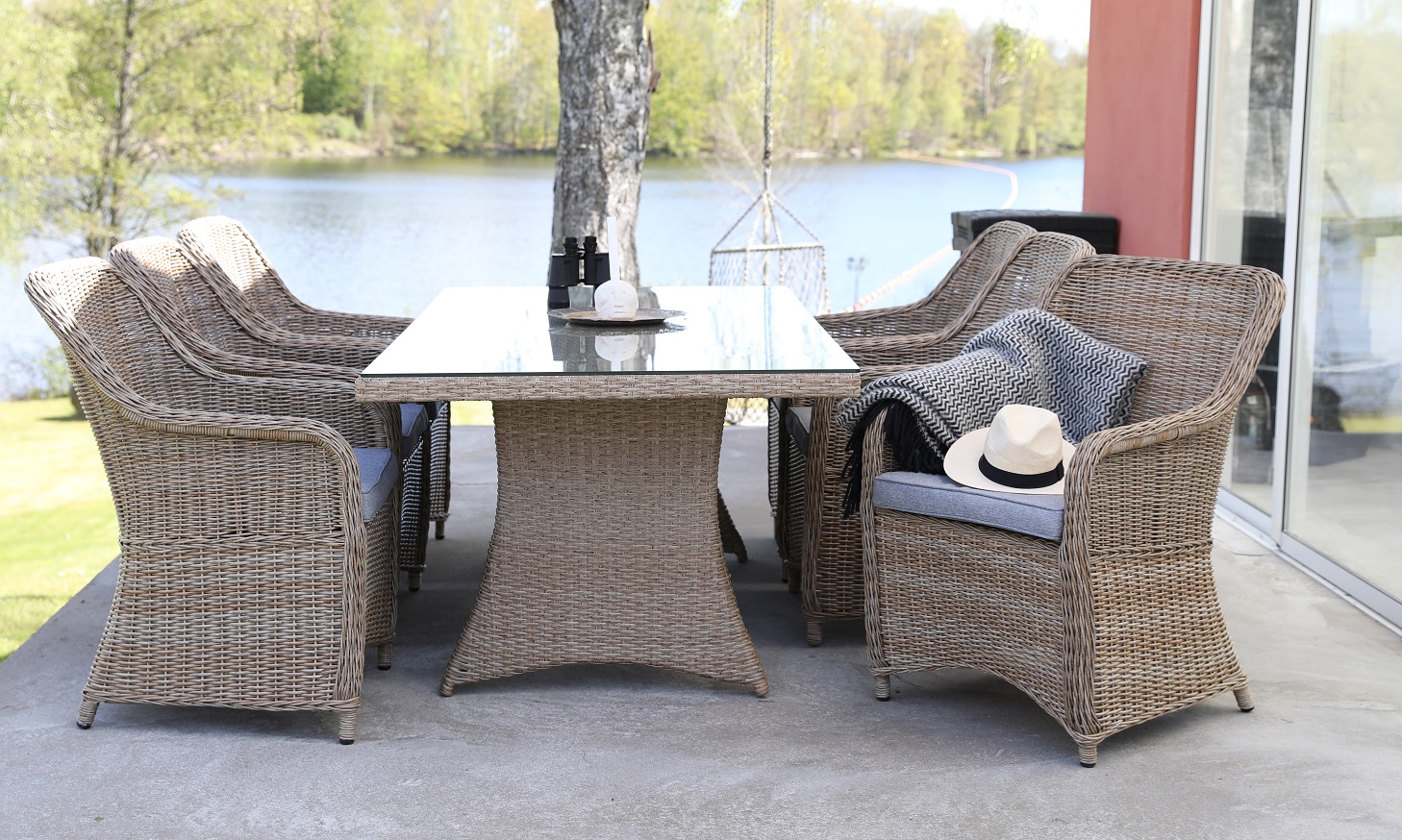 Matgrupp till uteplatsen / uterummet från Skånska Möbelhuset. Sienna matbord i naturfärgad rotting samt 6 st matchande Lotus fåtöljer. En matgrupp i harmoni där möblerna går snyggt ihop och skapar en helhet som är svåröverträffad.