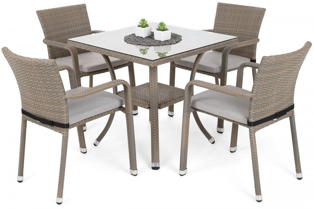 Utematgrupp med bord och fyra stolar som är stapelbara. Tillverkat i pulverlackerat aluminium och klätt i konstrotting. Bordet har en toppskiva tillverkat av 5 mm härdat glas. Sittdynor ingår.