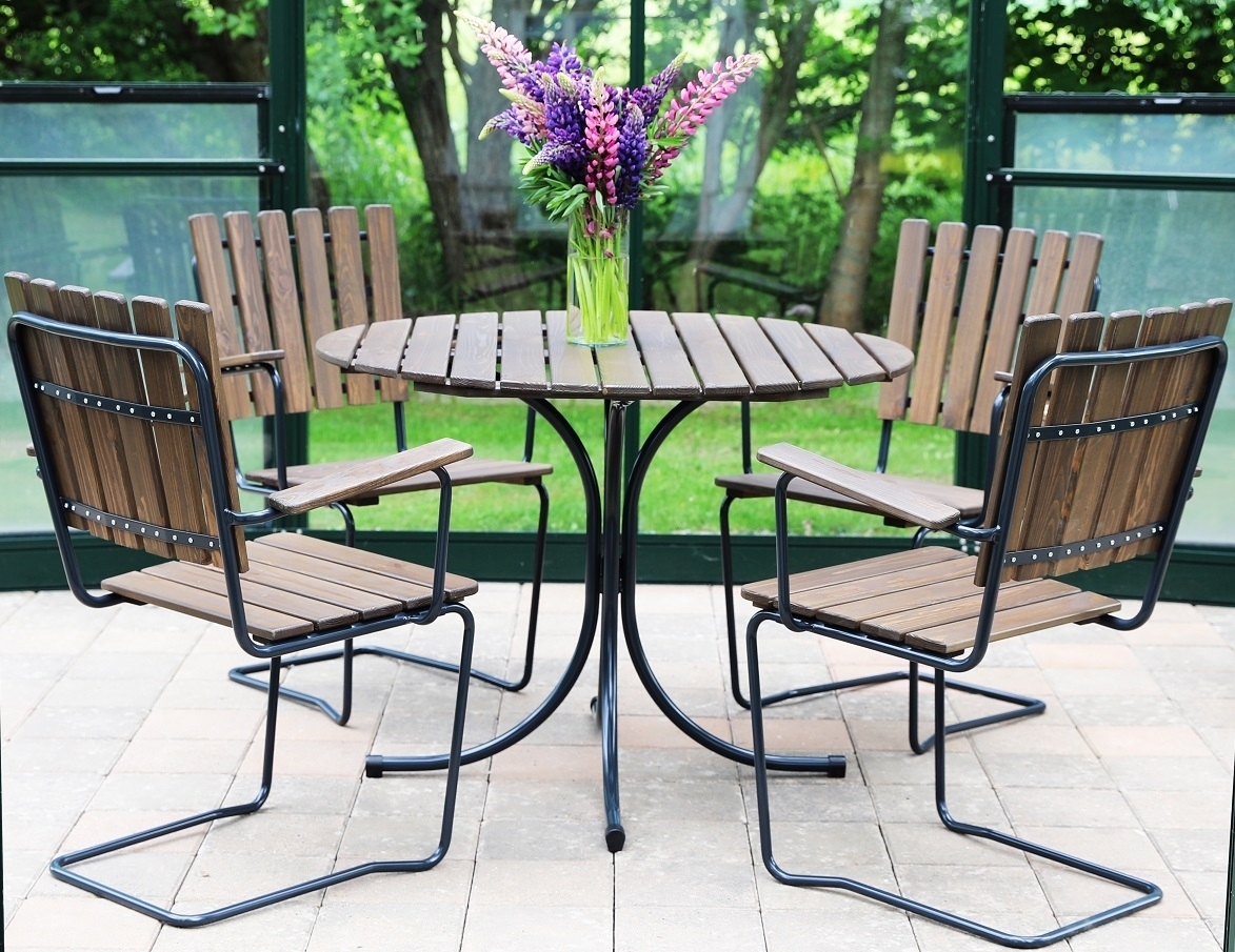 Klassiker som har exklusivt fjäderstål för att ge det rätta gunget. Producerad av högsta kvalitet på stål och trä. Klassisk matgrupp i brunlaserad furu / fjäderstål för uteplatsen, innehåller ett runt bord och 4 st stolar. Passar bra i de skandinaviska miljöerna. Stapelbara stolar.