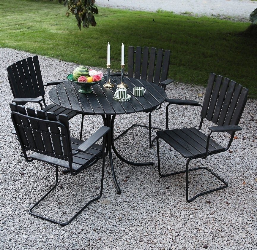 Klassiker som har exklusivt fjäderstål för att ge det rätta gunget. Producerad av högsta kvalitet på stål och trä i europa. Klassisk matgrupp i svartbetsad furu med svart fjäderstål för uteplatsen, innehåller ett runt bord och 4 st stolar. Passar bra i de skandinaviska miljöerna.
