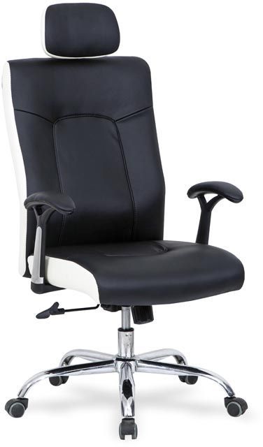 En skön kontorsstol med en modern design. Tillverkad i metall med detaljer i svart plast och en mycket behaglig klädsel i svart & vitt konstläder. Sitsen är höj-och sänkbar samt lätt att förflytta med hjälp av hjulen under stjärnfoten.