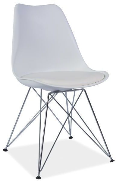 En snygg matstol med en modern design. Underredet är tillverkat av kromad metall och sitsen är av gjutformad plast med en sittdyna i konstläder.