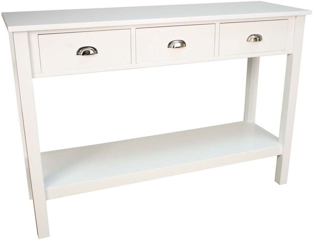 Ett stilrent konsolbord med en härlig design. Tillverkad i vitt MDF/trä, med tre praktiska lådor för förvaring som har metall handtag, samt en praktisk underhylla för övrig förvaring.
