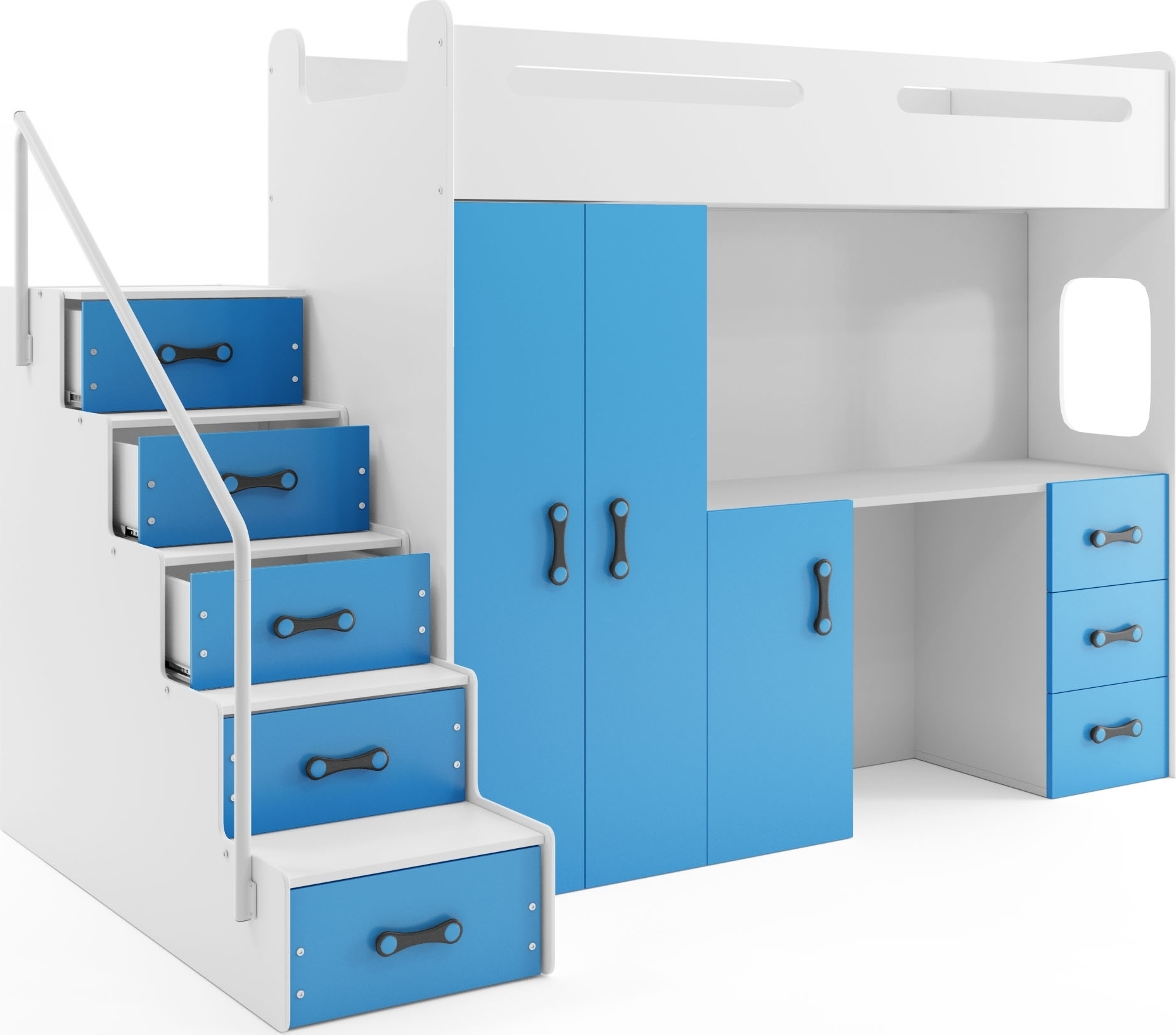 Loftsäng med skrivbord och förvaringsskåp. Trappan har fem förvaringslådor och kan monteras på valfri sida. Hela sängen är målad med vattenbaserad allergivänlig färg. Madrassen av 8 cm:s polyuretanskum har ett överdrag av hypoallergent polyestertyg. Överdraget är försett med blixtlås och kan tas av för tvättning. Sängen är tillverkad efter TÜV:s kvalitets- och säkerhetsstandard.