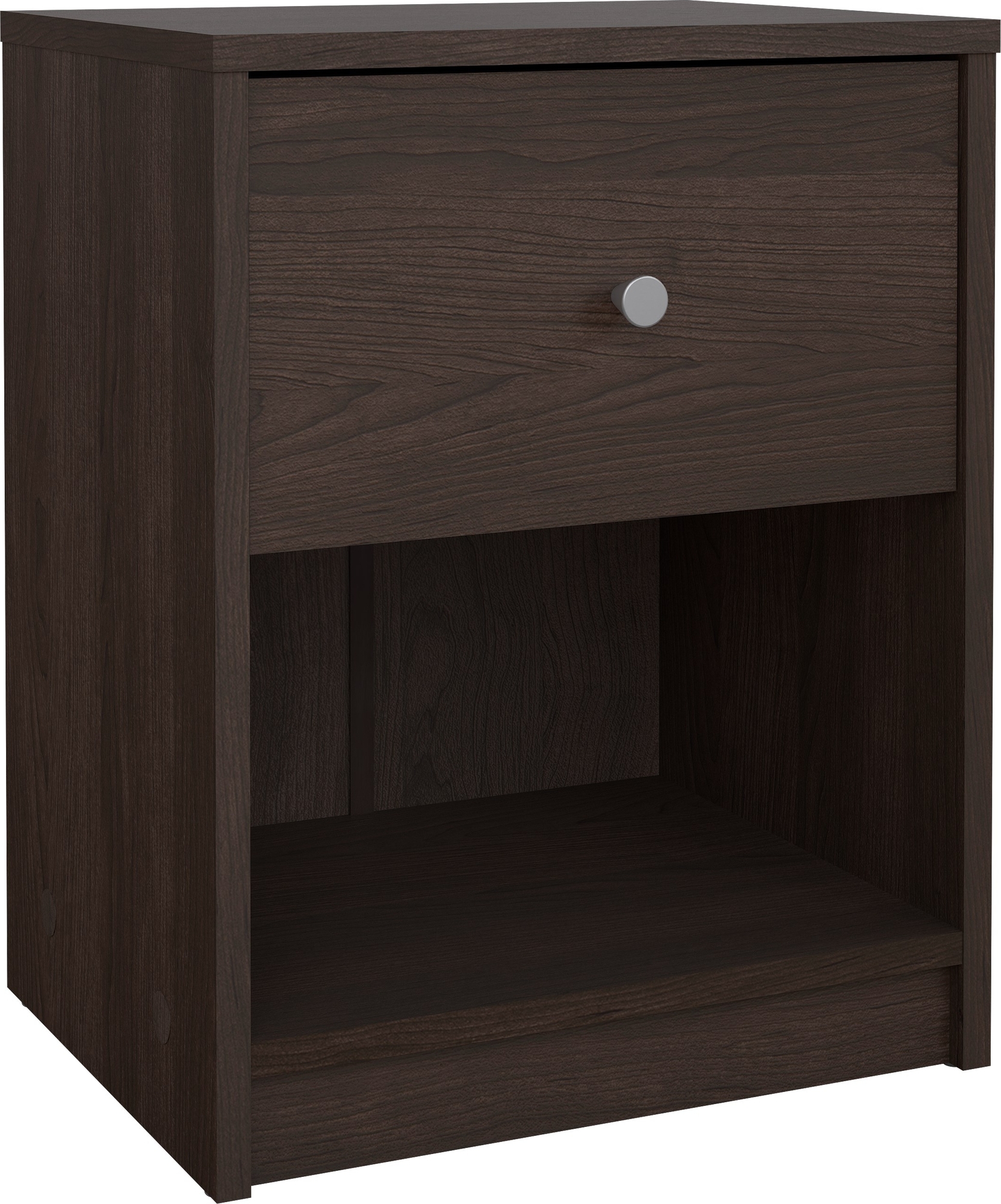 Sängbord av trä med kantband av melamin. Handtag och ben av plast.