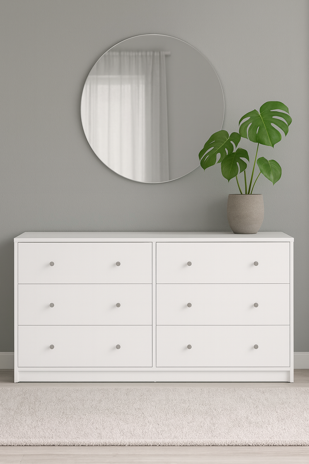 Byrå vit med 6 lådor 143 cm bred + Möbeltassar