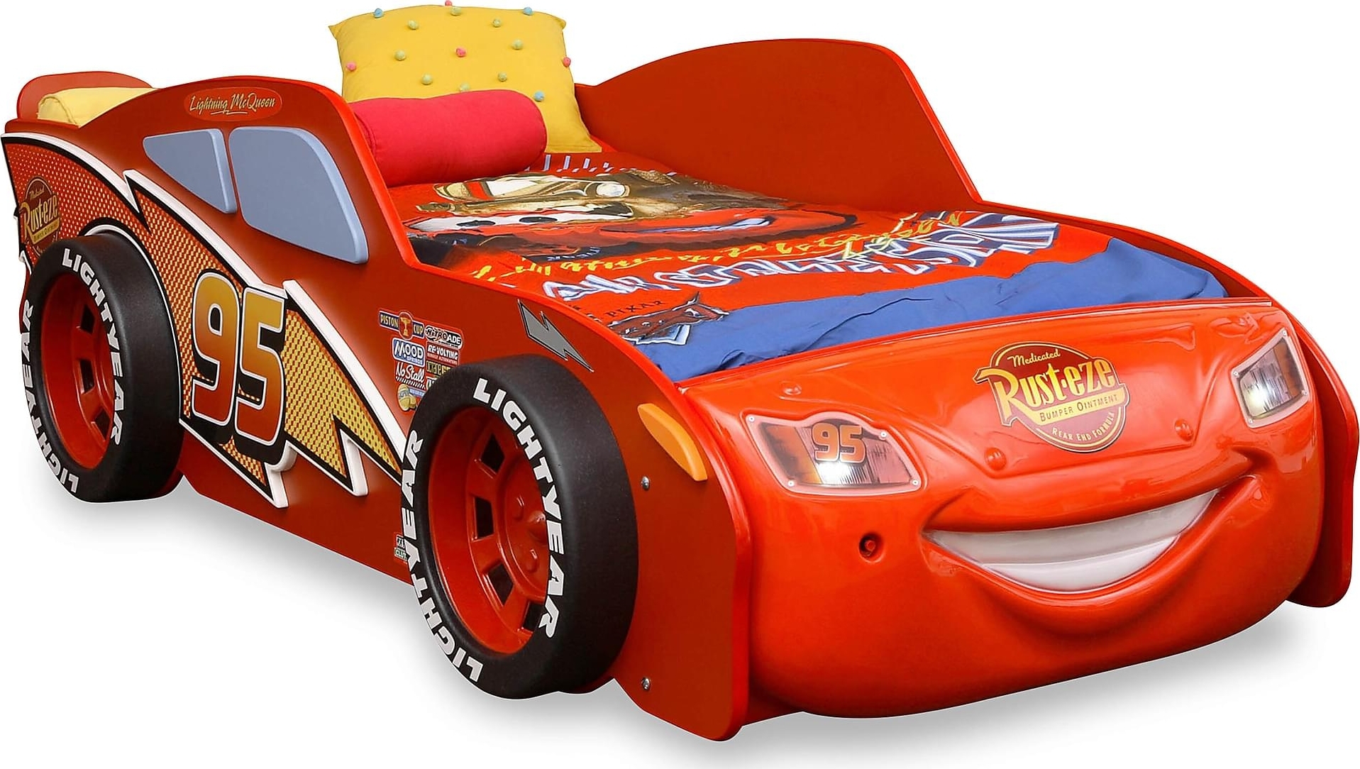 Barnsäng för fans av de animerade filmerna "Bilar" och Blixten McQueen. Stommen är av trä med detaljer i hårdplast. Madrass av polyester och bomull ingår.