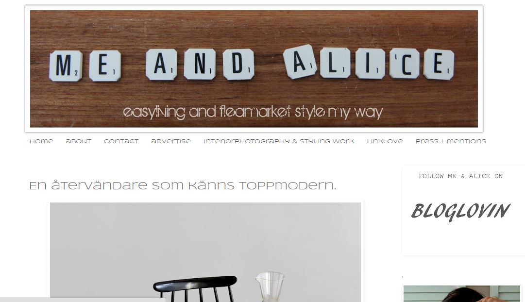 Susanne som driver ME AND ALICE har flyttat från storstaden till en mindre ort i Dalarna där arbetar hon idag med sina stora intressen som frilansande fotograf, inredningsstyist och skribent. Det vi får se är det egna hemmet men också annat som inspierar som gammal och ny design, bilder från mässor och emellanåt lite personliga reflektioner över det dagliga livet. Hem som Susanne tar sig an att göra reportage om kan återfinnas i några av de större inredningsmagasinen i Norden, arbete som hon också delar med sig av under kategori reportage. Recykling är en rubrik bland många att titta närmare på med fantasifull återvinning av allsköns ting som blir fina inredningsdetaljer, ett linne som använts både som just det linne alltså och lampskärm och som dekoration på vägen uppsatt med washitejp. Kjol som inte längre används hamnar på en stol som ny stolsits, gammal backspegel blir en bordsspegel och att använda ett gammalt ljuster som ljusstake placerad i en lagom stor spricka i bordet är verkligen kreativt.