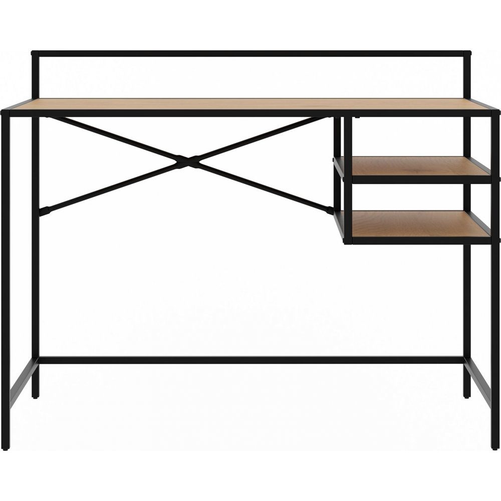 Elegant och funktionellt skrivbord som kombinerar natur och modern design. Skrivbordet är gjort med en vacker träyta och en stomme i svart metall, vilket ger en stilren och minimalistisk look.