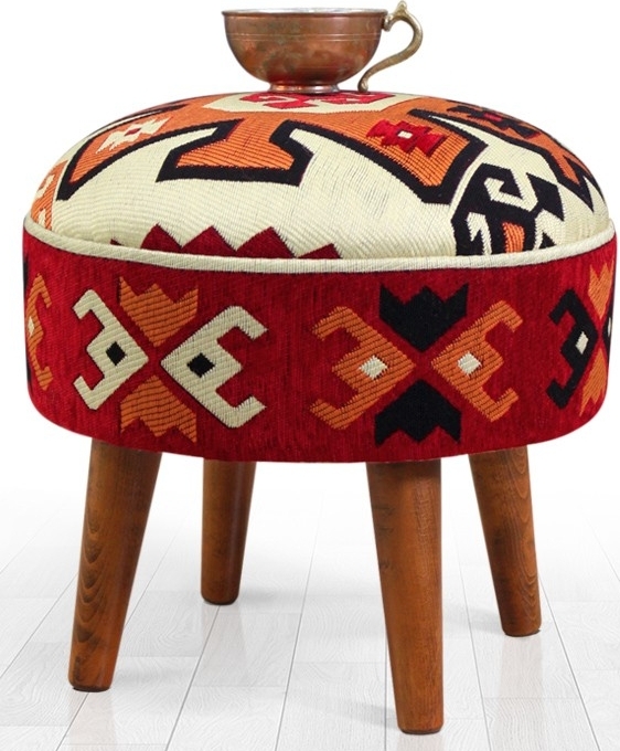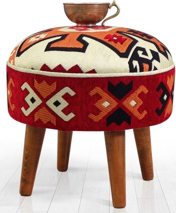 Sittpuff av trä. Klädd med bomull och polyester. Stoppning av skum.