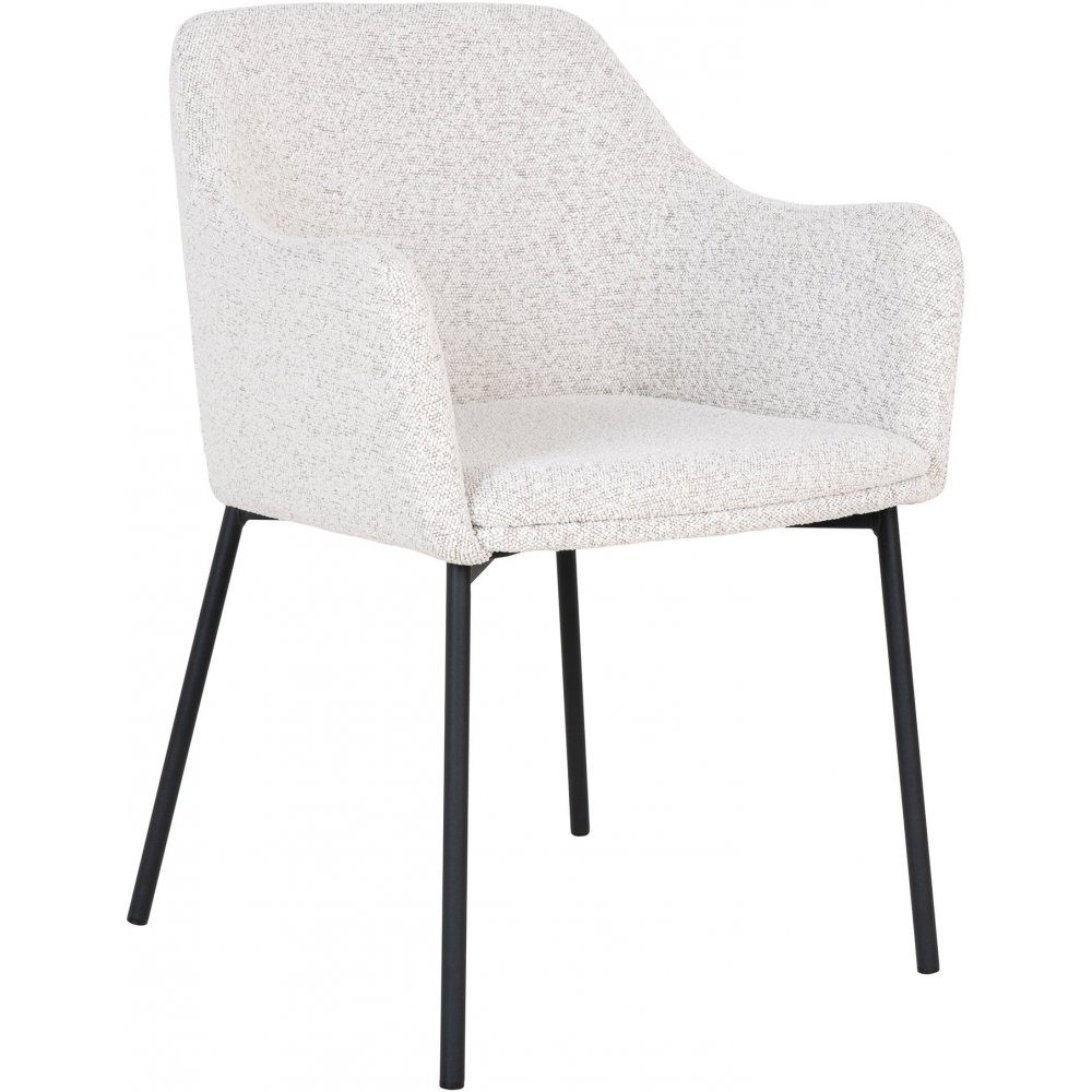 Matstol av plywood med underrede av stål och klädsel av boucletyg. Levereras omonterad.