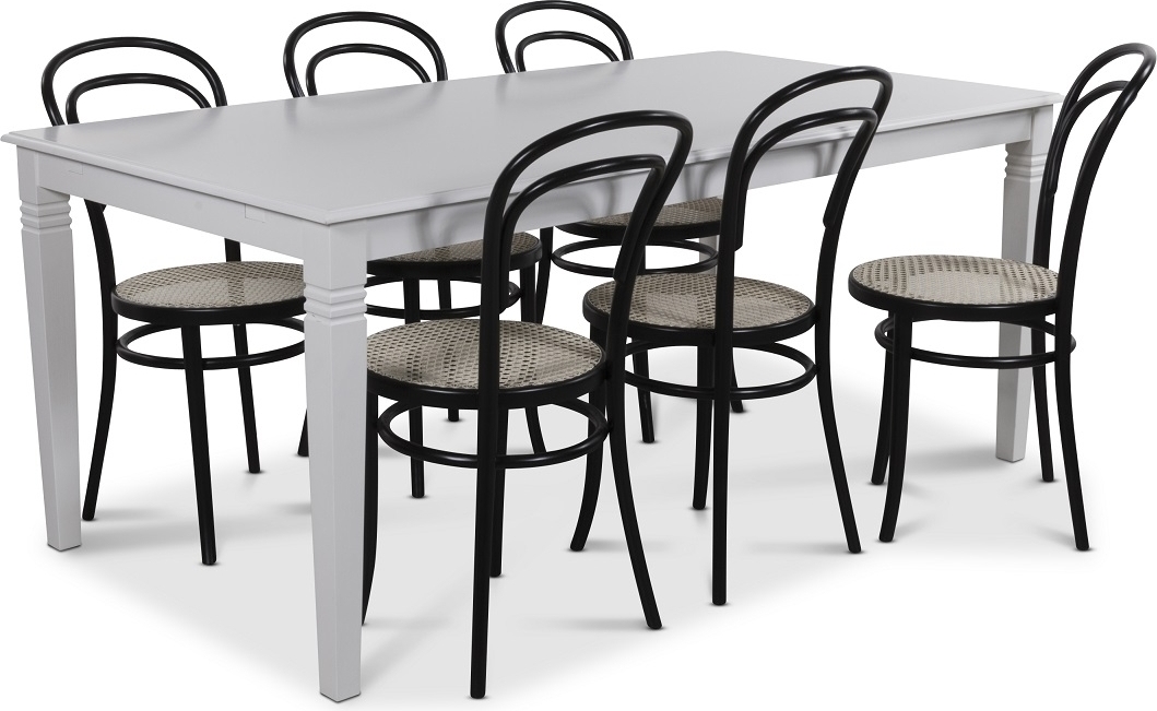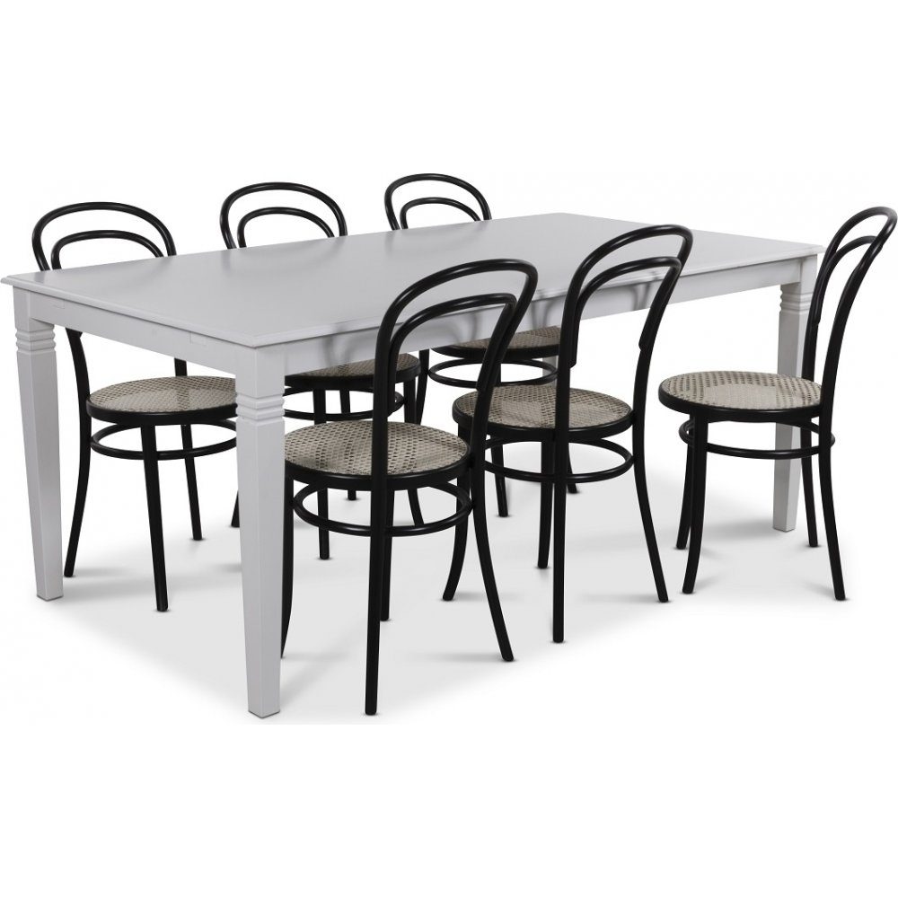 Matgrupp Mellby från Skånska Möbelhuset, Klassiskt 180 cm matbord i vitlackat trä. Sex stycken svarta klassiska Thonet No14 matstolar!