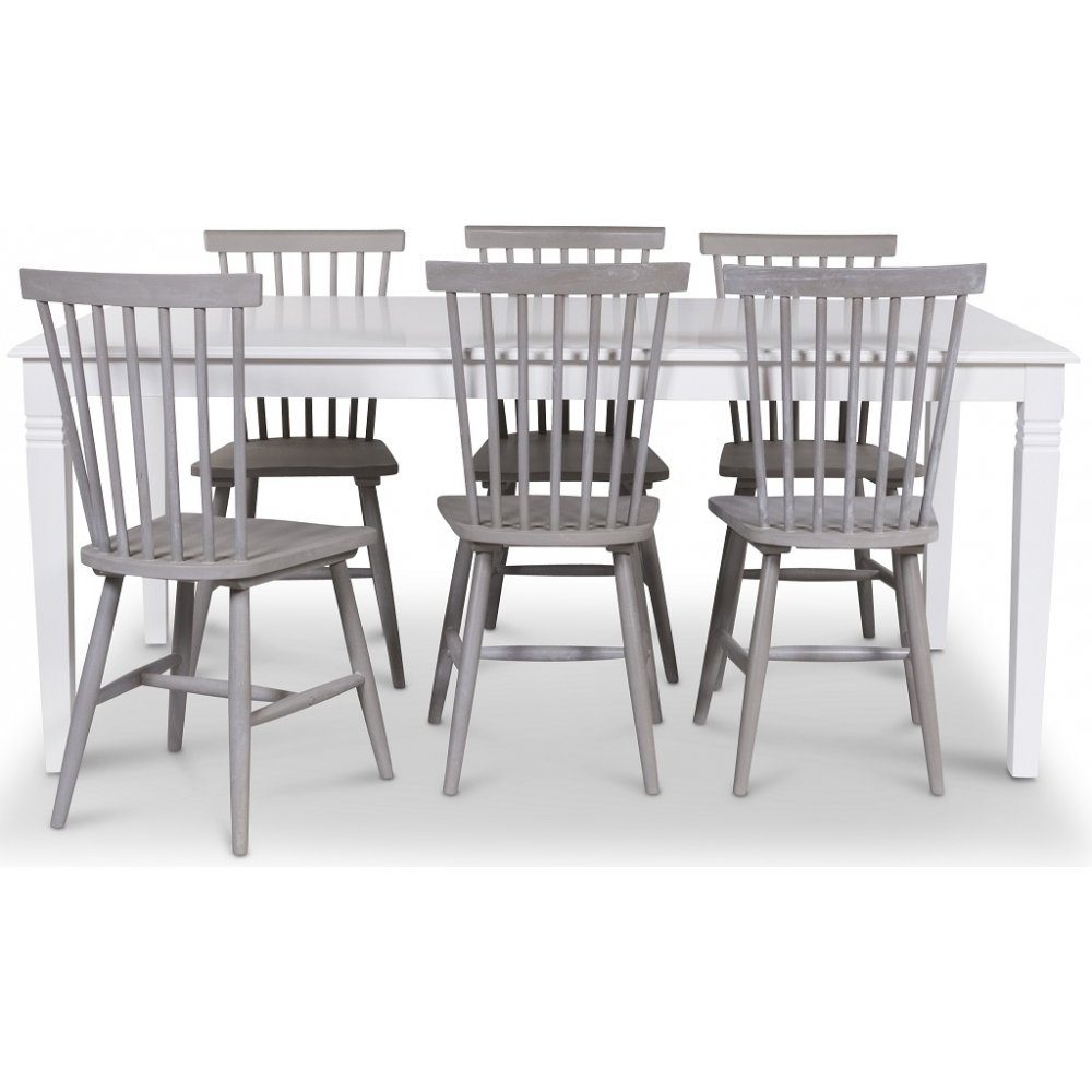 Matgrupp från Skånska Möbelhuset, Klassiskt 180 cm matbord i vitlackat trä. Sex stycken klassiska Karl-Oskar pinnstol i gråbetsat trä!