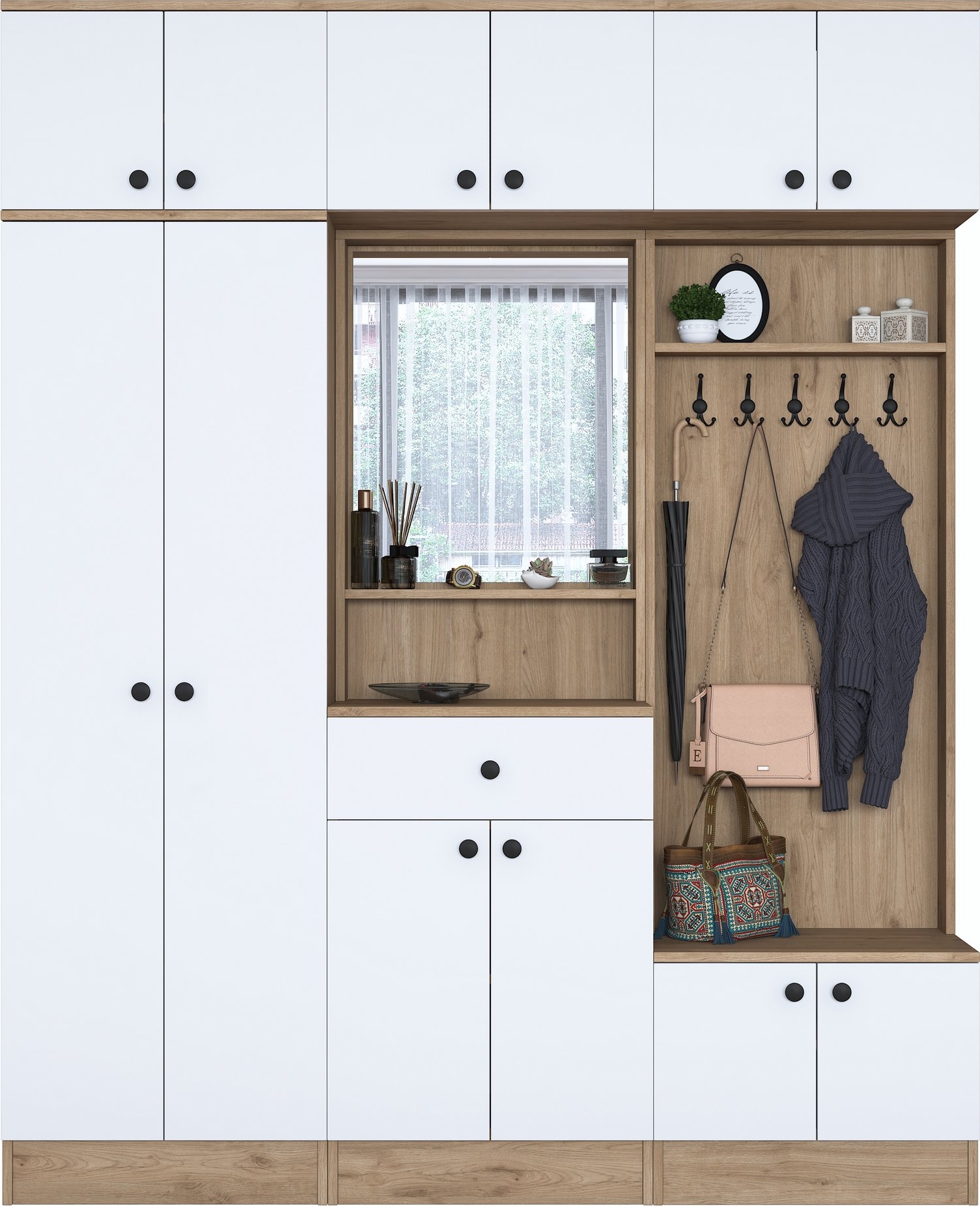 Mendy hallmöbel 180 cm med överskåp - Vit/valnöt