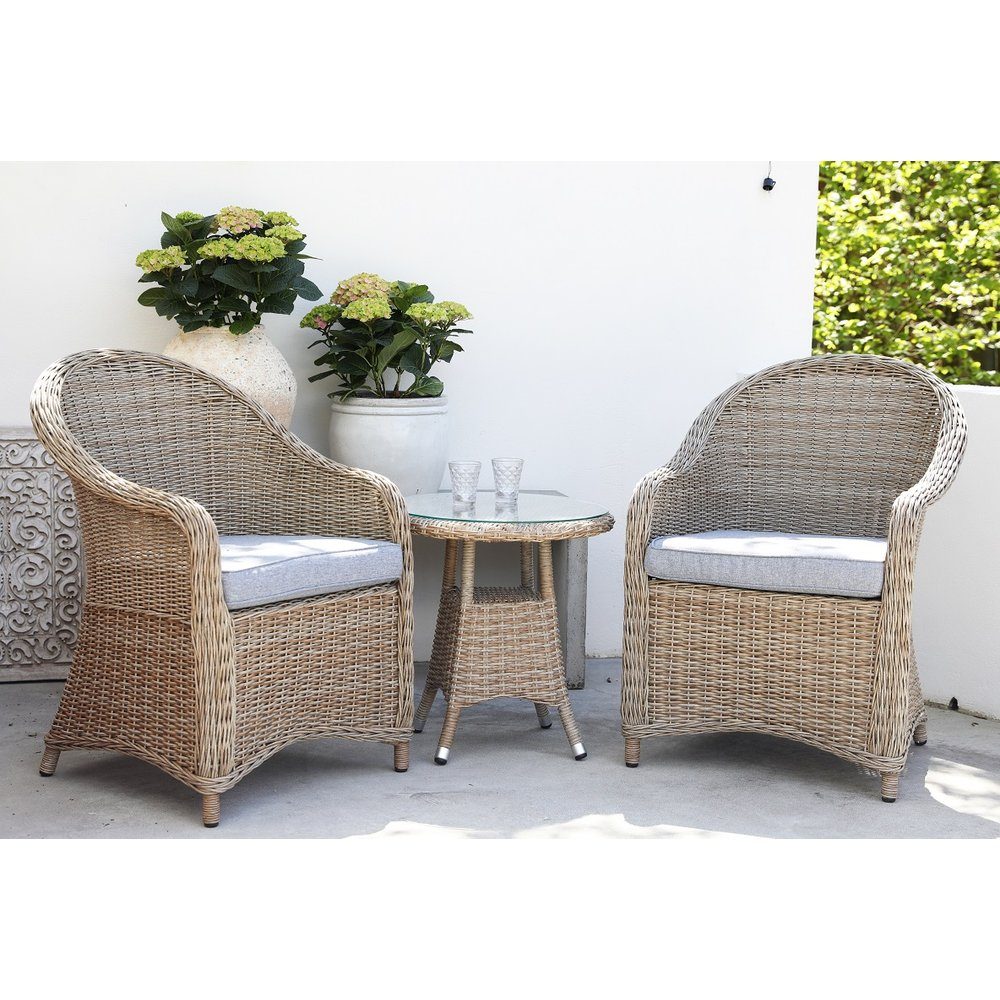 Fåtöljset Mercury i klassisk design. Setet består av två fåtöljer och ett nätt sidobord med glastoppskiva, allt i matchande naturfärgad konstrotting. Passar bra för avkoppling ute på uteplatsen, terrassen etc. Inklusive ljusgråa dynor. Dubbelvävd halvrund konstrotting.